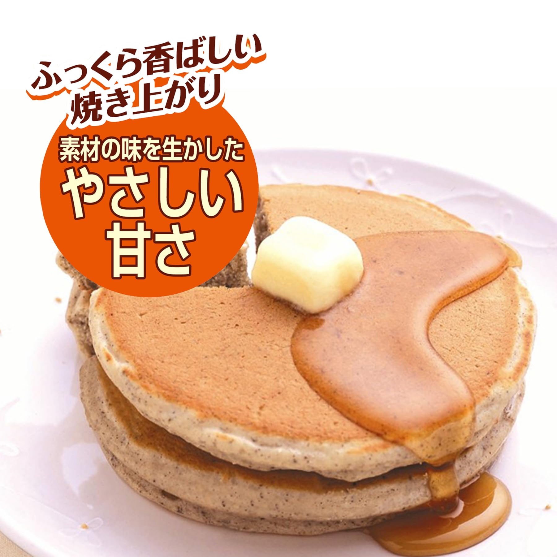 2種類の「豆」(大豆・小豆)と、バランスのとれた5種類の「穀物」(大麦・黒ごま・もちきび・もちあわ・黒米)を粉にしたホットケーキミックスです。