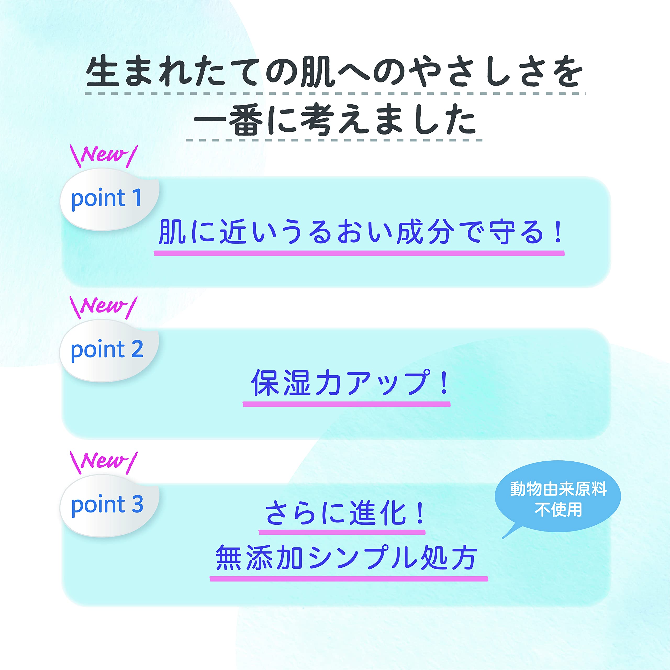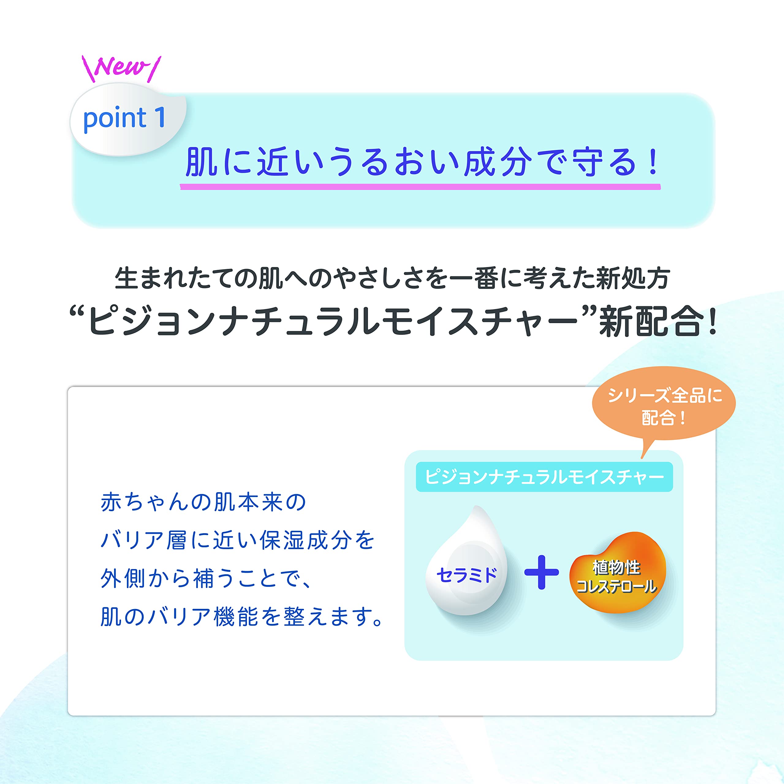 赤ちゃんのお肌へのやさしさをいちばんに考えたスキンケア。未熟な赤ちゃんの肌に不足しがちな、お肌本来のるおい類似成分「ピジョンナチュラルモイスチャー※」配合した全身泡ソープです。※セラミドNP+イソステアリン酸フィトステリル<全身泡ソープ 詰めかえ用3.5回分1400ml (ベーシック)の特長>●ふわふわ無添加※泡でお肌をやさしく洗います※パラベン・アルコールフリー●赤ちゃんのお肌に近い弱酸性●肌にやさしいシンプル処方●皮フ科医による皮フ刺激性テスト済み(すべての方に肌トラブルが起きないというわけではありません)●硫酸系界面活性剤を使用していません