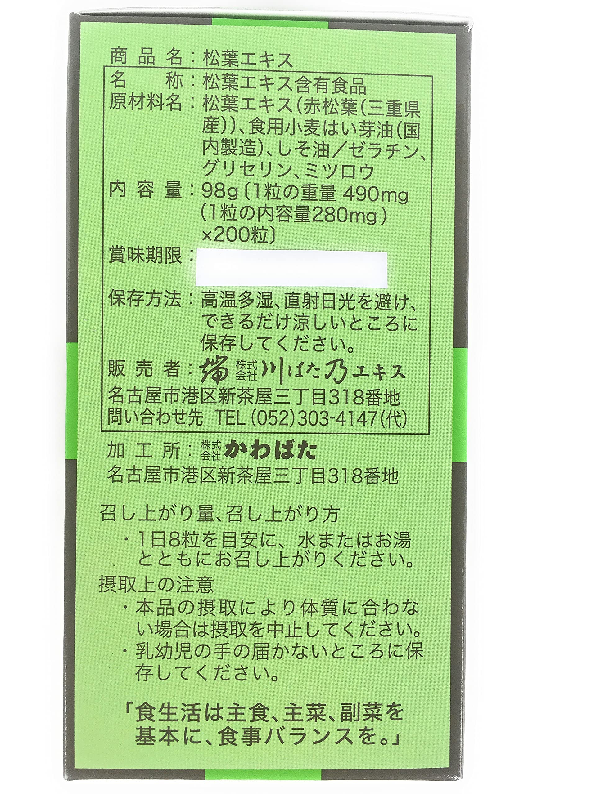 製造方法:伝統製法で作った松葉エキスをソフトカプセルで飲みやすく仕上げました。
