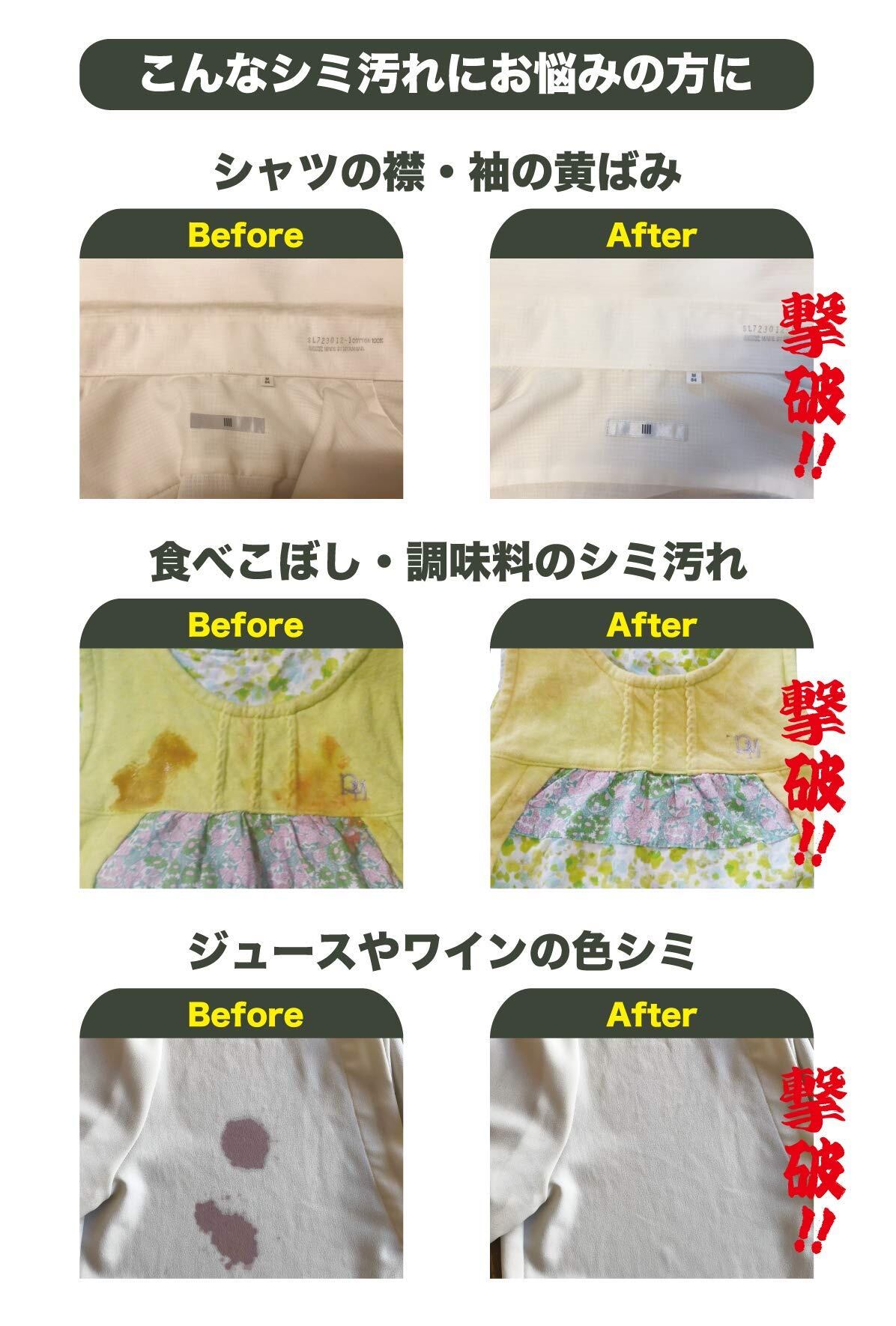 ●漂白効果のある過炭酸ナトリウムと洗浄効果のある界面活性剤をダブルで配合し、2方向からアプローチすることにより効果を最大限発揮します。 ●食べこぼしや油汚れ、皮脂などの汚れは酸性の汚れです。それらに対し、逆の液性である弱アルカリ性を採用することで、より汚れを落としやすくしています。 ●いちいちもみ洗いやこすり洗いをする必要がなく、つけ置きするだけで良いので手間がかからず手軽に行うことができます。