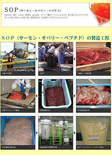 ◎『SOP(サーモン・オバリー・ペプチド)』とは? 国産天然鮭由来の栄養食品です。 鮭の筋子(卵巣)からイクラを作った時に残るヒモ状の筋(卵巣外皮)を分解して作られたもので、海のプラセンタ(胎盤)とも呼ばれています。 SOPとプラセンタ(胎盤)は人に対する機能性などが非常によく似ております。 ペプチドは、タンパク質がアミノ酸に分解される途中の結合体で、タンパク質より消化吸収に優れるとされます。 アミノ酸が10個以上結合したものをポリペプチド、10個以下のものをオリゴペプチドといいます。