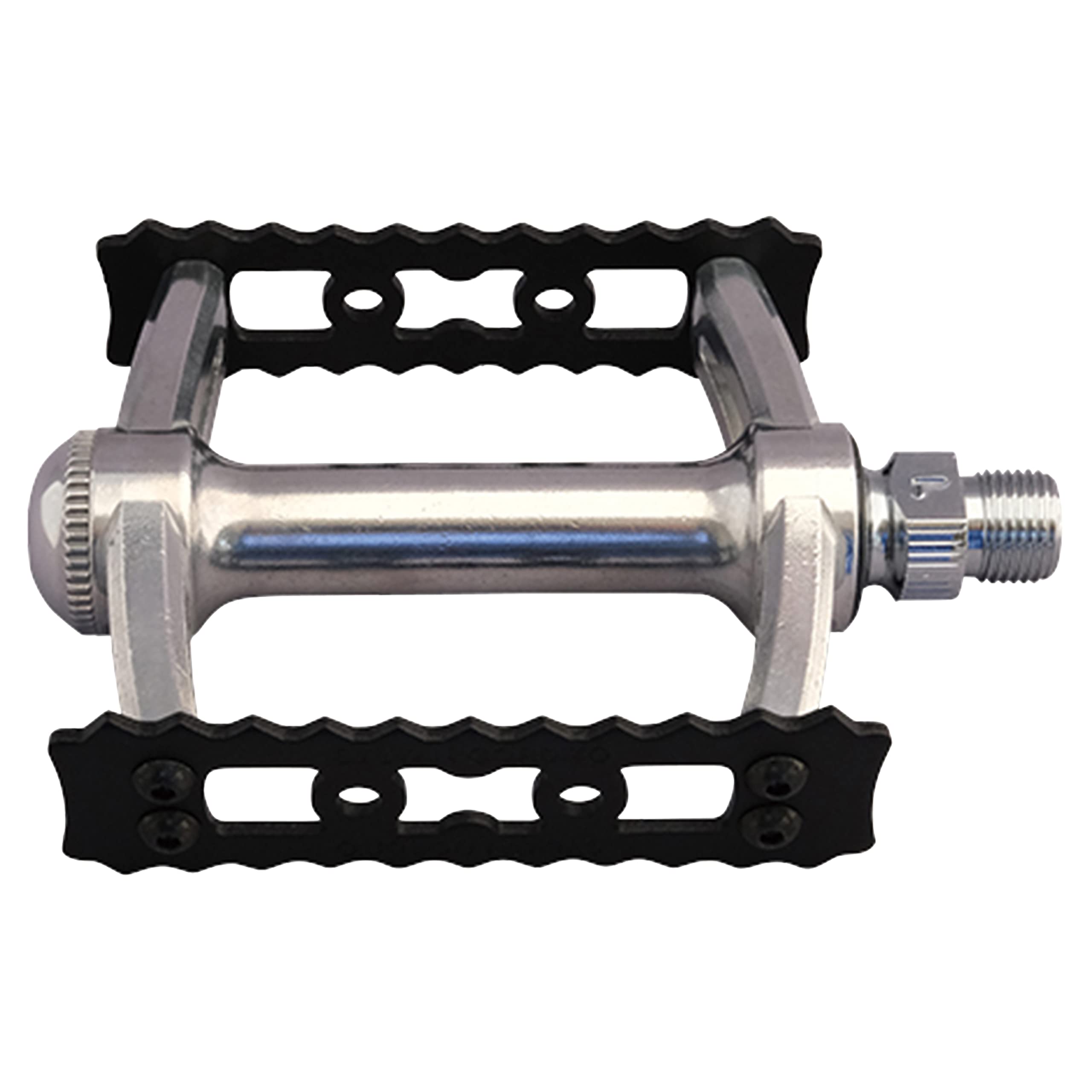 Gorditoはスペイン語で(愛着を込めて)“ぽっちゃり”という意味を持ちます。 約94m m×85m mの踏面はSylvan シリーズ中最大で、しっかりと足を預ける事ができます。 快適なライディングを好まれる方や、足の大きな方へおすすめするペダルです。 M4ボタンネジで固定された側板は傷んだ場合に取り換えが可能。 更にカップ&コーンベアリング採用の為、長期にわたって ご愛用いただけます。 ●商品仕様等 アルミ合金ボディ 両面踏み 430g トークリップ取付可能 カップコーンベアリング