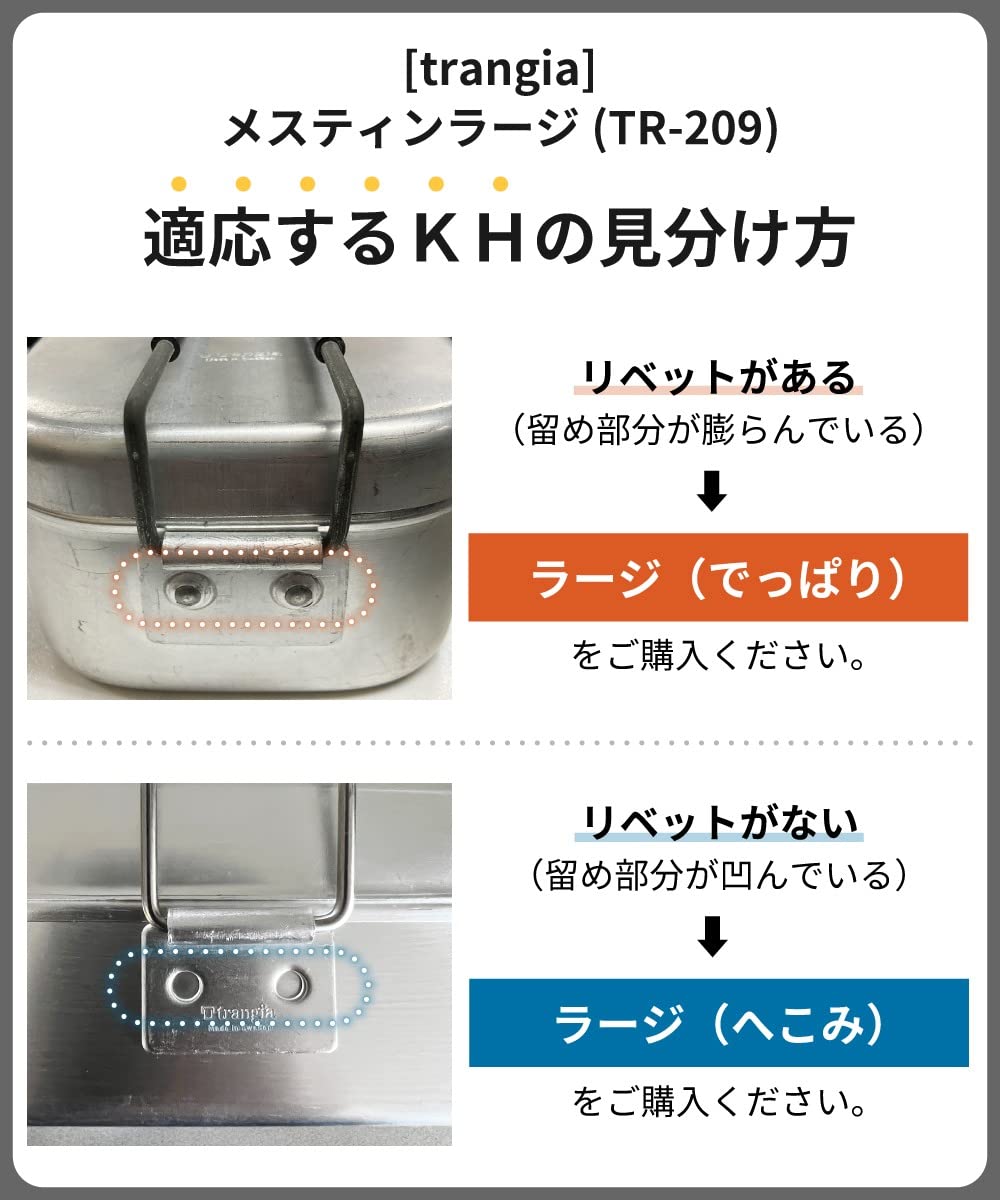 【適応するKHの見分け方】[trangia]ラージメスティン(TR-209)は2020年春頃から一時期のみリベットの仕様変更が見られたようです。それぞれの仕様(リベットのでっぱりorへこみ)に合うように、KHも2種類ご用意しました。 ■リベットがある(留め部分が膨らんでいる)→ラージ(でっぱり)をご購入ください。 ■リベットがない(留め部分が凹んでいる)→ラージ(へこみ)をご購入ください。