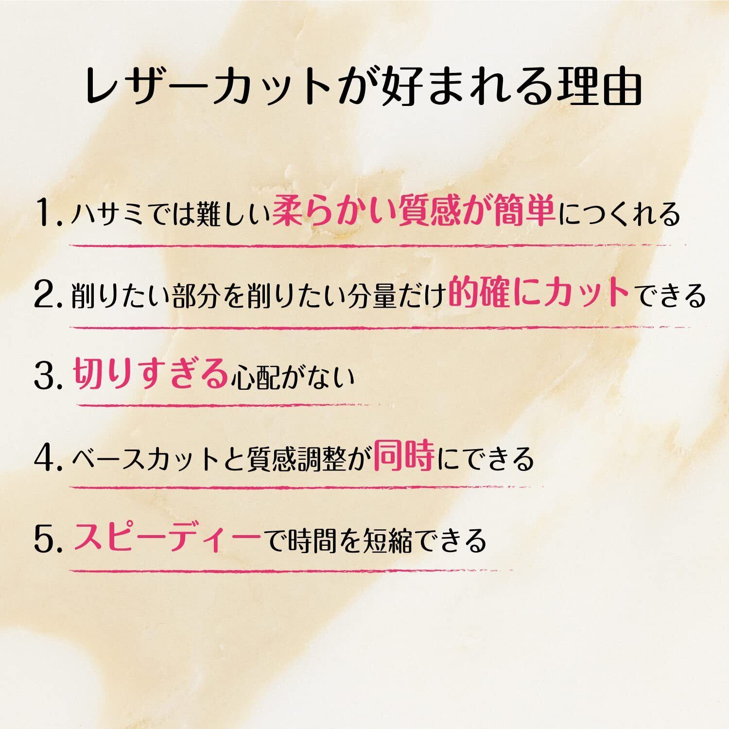 レザーカットが好まれる理由。 1. ハサミでは難しい柔らかい質感が簡単に作れる。 2. 削りたい部分を削りたい分量だけ的確にカットできる。 3. 切りすぎる心配がない。 4. ベースカットと質感調整が同時にできる 5. スピーディーで時間を短縮できる。