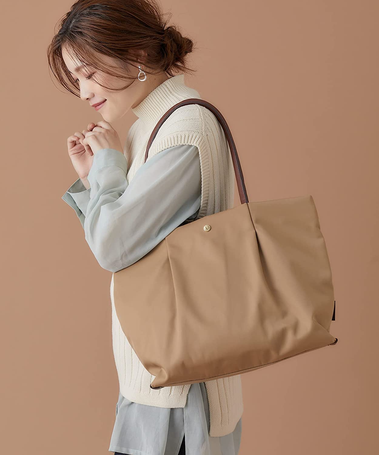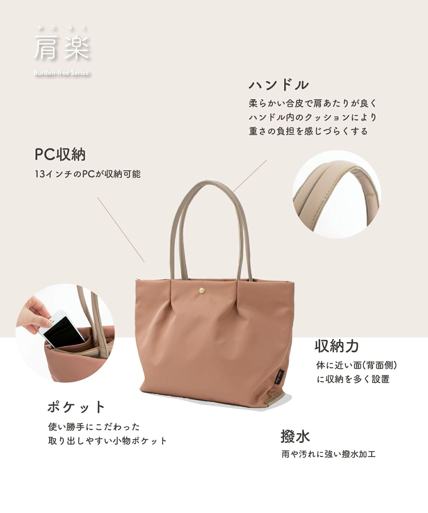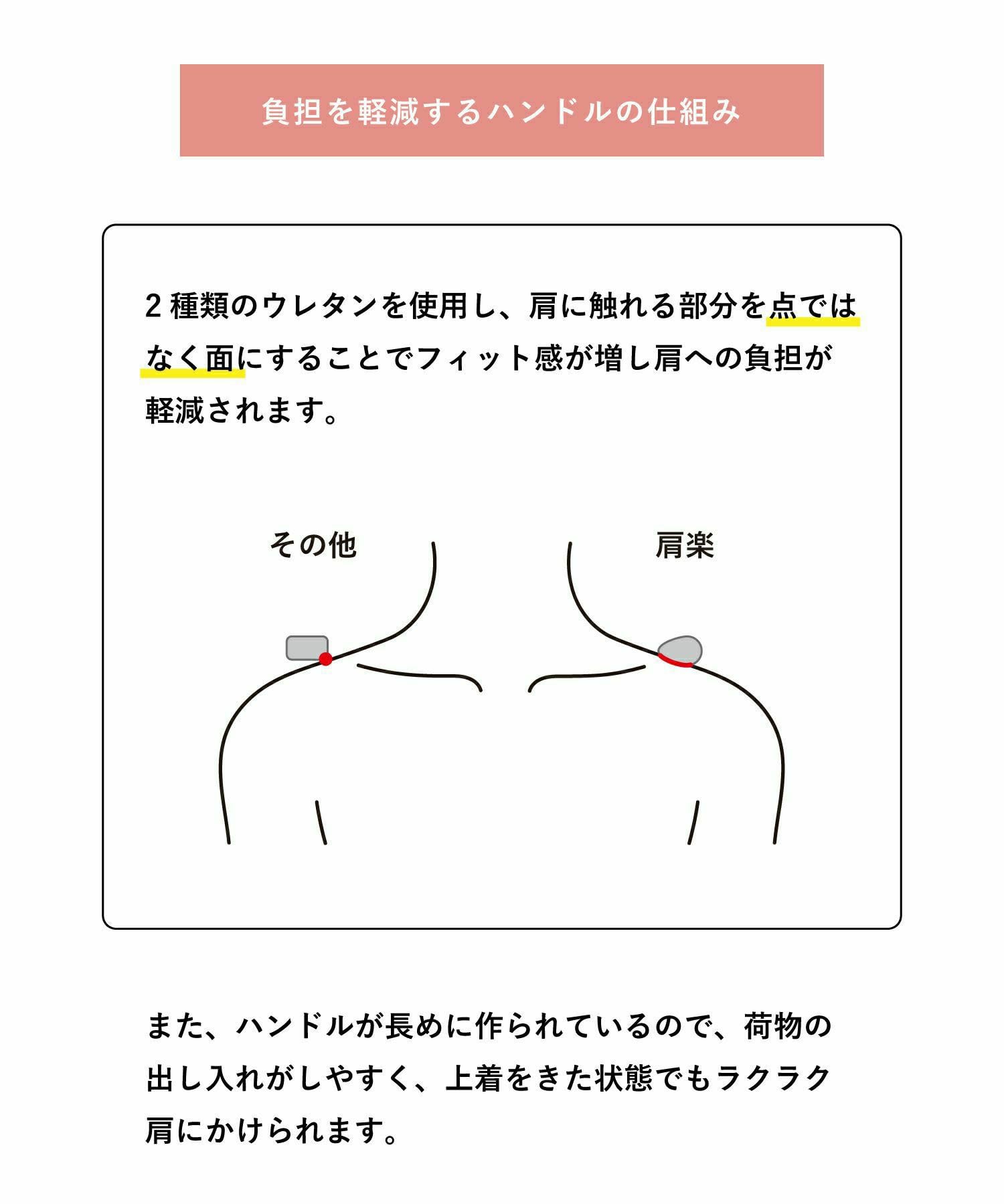 肩の負担を軽くするために、ハンドル内のクッション材にこだわりました。13インチのPCが収納できるポケットの他に、ポケットが5つあり、使い勝手も抜群。嬉しい撥水加工で、雨の日でも安心です。A4サイズもしっかり収納できるので、通勤や通学にもオススメ。