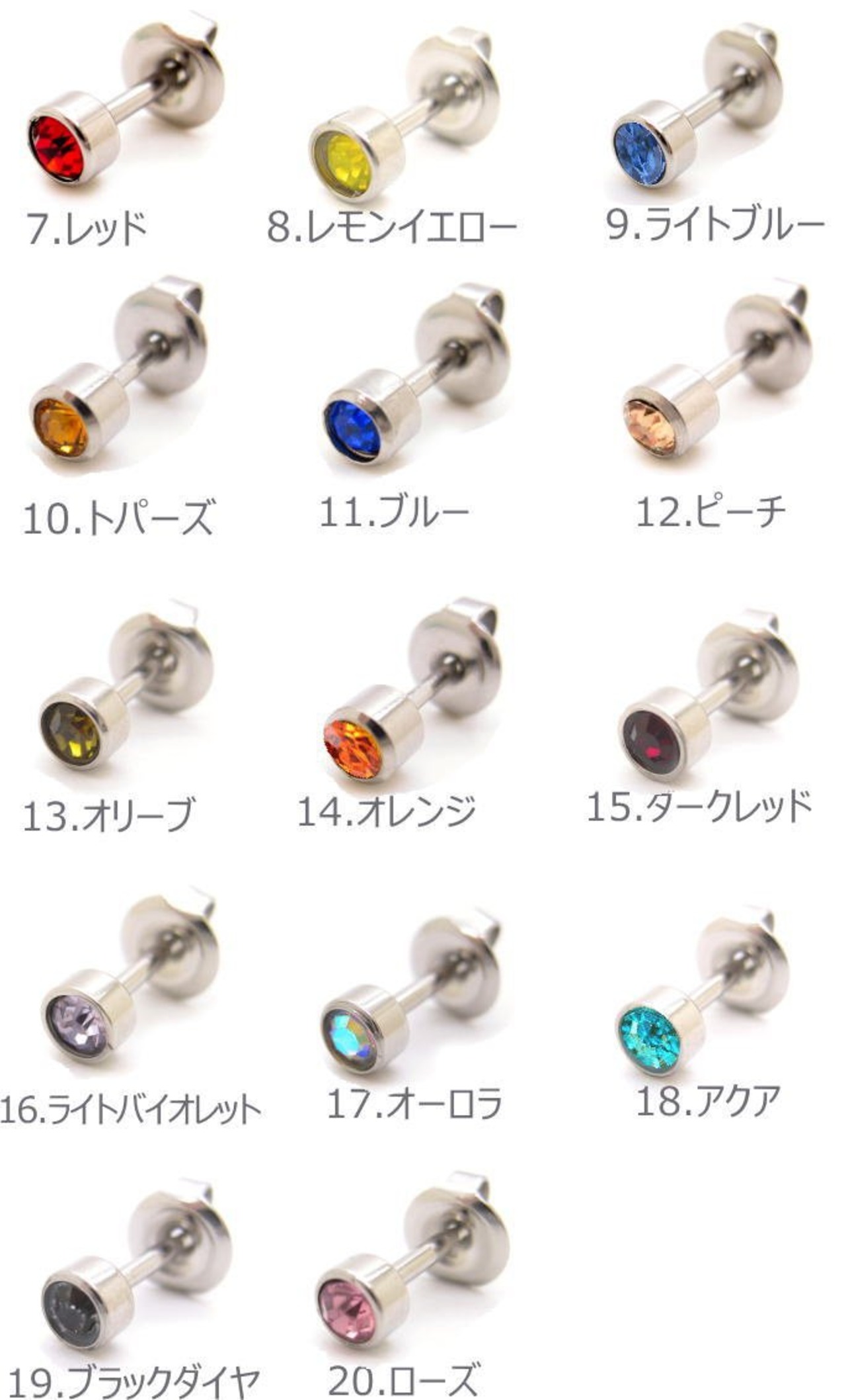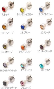 材質:サージカルステンレス316L、グラスストーン サイズ:16G(約1.2mm)一般的な耳用ピアッサーの太さです。ヘッドの直径4mm、ヘッド部分からキャッチまでの間は6mm、針全体の長さは10mm