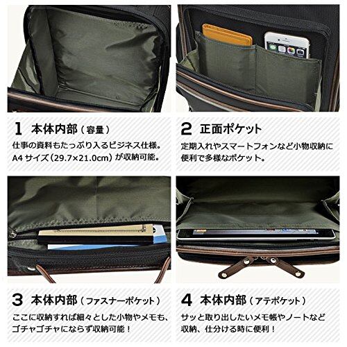 本体内部:アテポケット、ファスナーポケット 背面:アテポケット 正面ファスナーアウトポケット内部:2分割小物ポケット