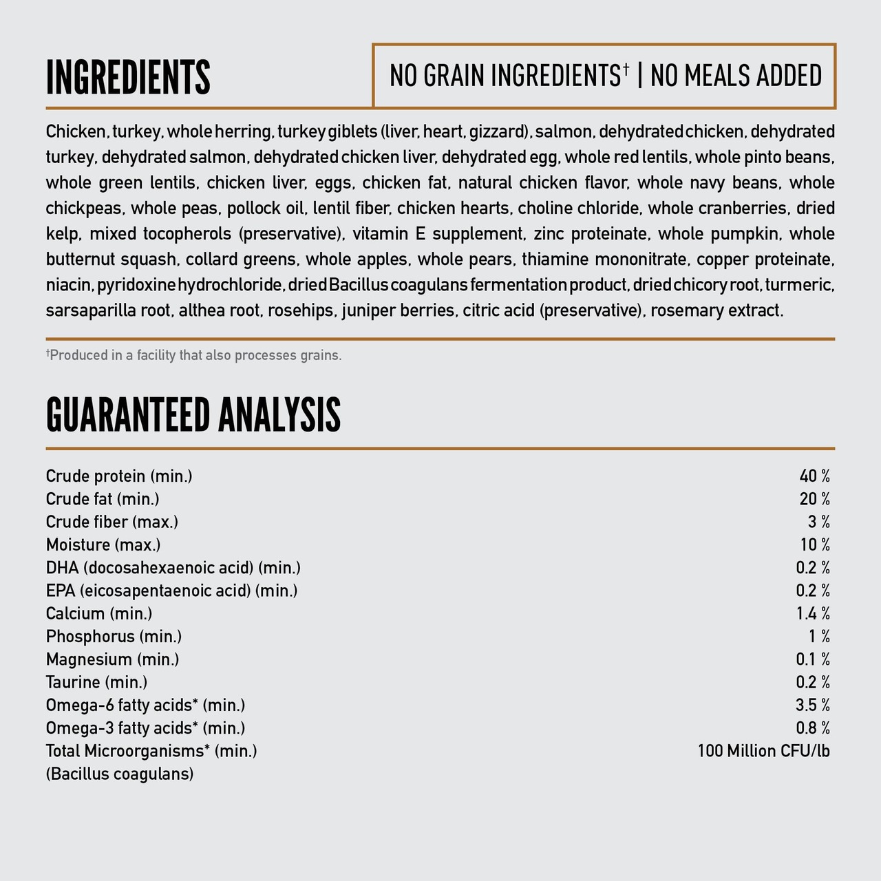 新鮮鶏肉, 新鮮七面鳥肉, 新鮮イエローテイルカレイ, 新鮮全卵, 新鮮丸ごと大西洋サバ, 新鮮鶏レバー, 新鮮七面鳥レバー, 新鮮丸ごと大西洋ニシン, 新鮮鶏心臓, 新鮮七面鳥心臓, ディハイドレート鶏肉, ディハイドレート七面鳥肉, ディハイドレート丸ごとサバ, ディハイドレート鶏レバー, ディハイドレート七面鳥レバー, 丸ごとグリーンピース, 丸ごとシロインゲン豆, 赤レンズ豆, 新鮮チキンネック, 新鮮鶏腎臓, 鶏肉脂肪, ピント豆, ヒヨコ豆, グリーンレンズ豆天然鶏肉風味, レンズ豆繊維, ニシン油, 粉砕鶏骨, 鶏軟骨, 七面鳥軟骨, ドライケルプ, フリーズドライ 鶏レバー, フリーズドライ七面鳥レバー, 新鮮丸ごとカボチャ, 新鮮丸ごとバターナッツスクワッシュ, 新鮮ケール, 新鮮ホウレン草, 新鮮カラシ菜, 新鮮コラードグリーン, 新鮮カブラ菜,新鮮丸ごとニンジン, 新鮮丸ごとリンゴ, 新鮮丸ごと梨, カボチャの種, ヒマワリの種, 塩化コリン, 亜鉛タンパク化合物, 銅タンパク化合物, ミックストコフェロール(天然酸化防止剤),チコリー根, ターメリック, サルサ根, アルテア根, ローズヒップ, ジュニパーベリー, 乾燥 ラクトバチルスアシドフィルス菌発酵生成物, 乾燥 プロバイオティクス発酵生成物, 乾燥 ラクトバチルスカゼイ発酵生成物.