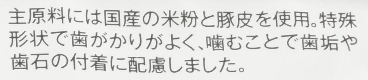 主原料には国産の米粉と豚皮を使用。■オリゴ糖や乾燥おからを配合し、お腹の健康維持に配慮。■特殊形状で歯がかりが良く、噛むことで歯垢や歯石の付着にも配慮。■クロロフィルを豊富に含むクロレラを配合。■お口の小さい小型犬にも食べやすいミニサイズ。