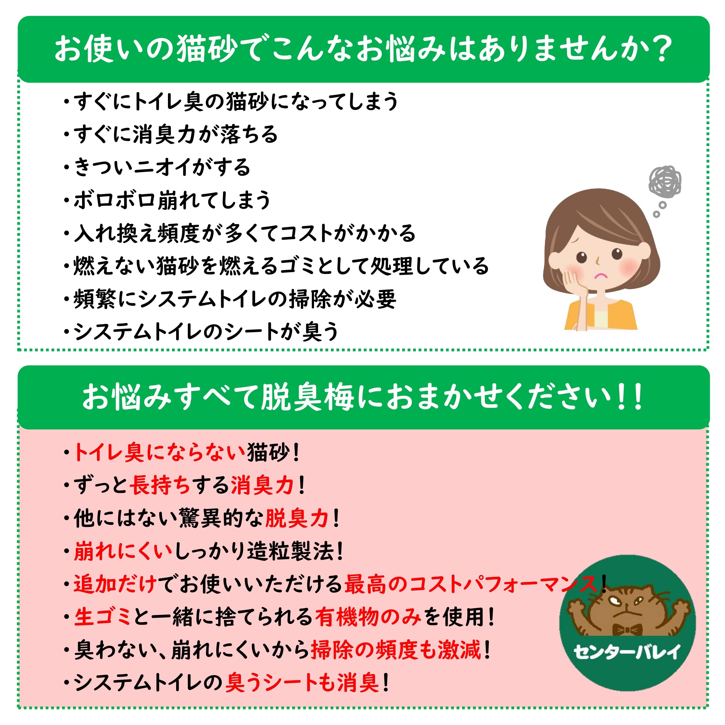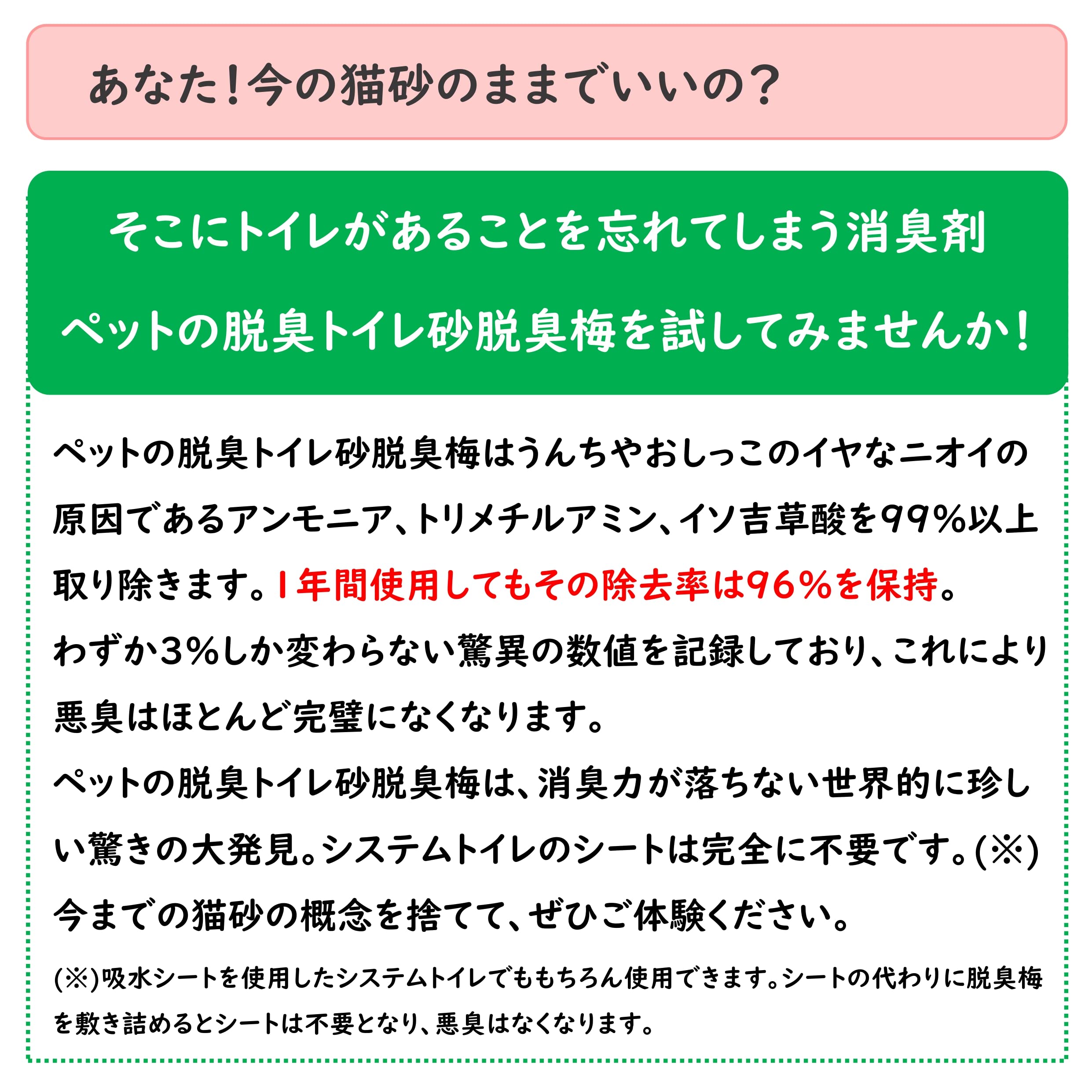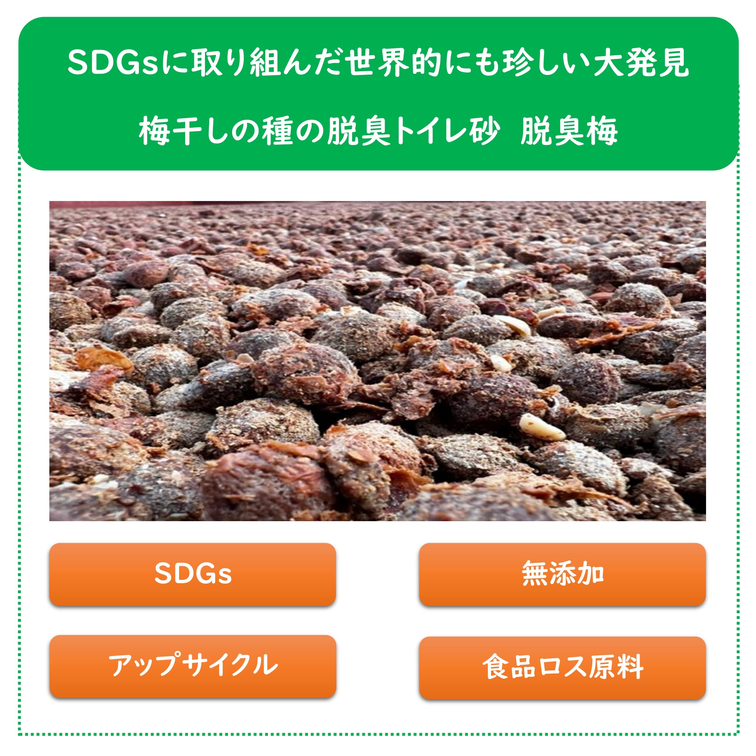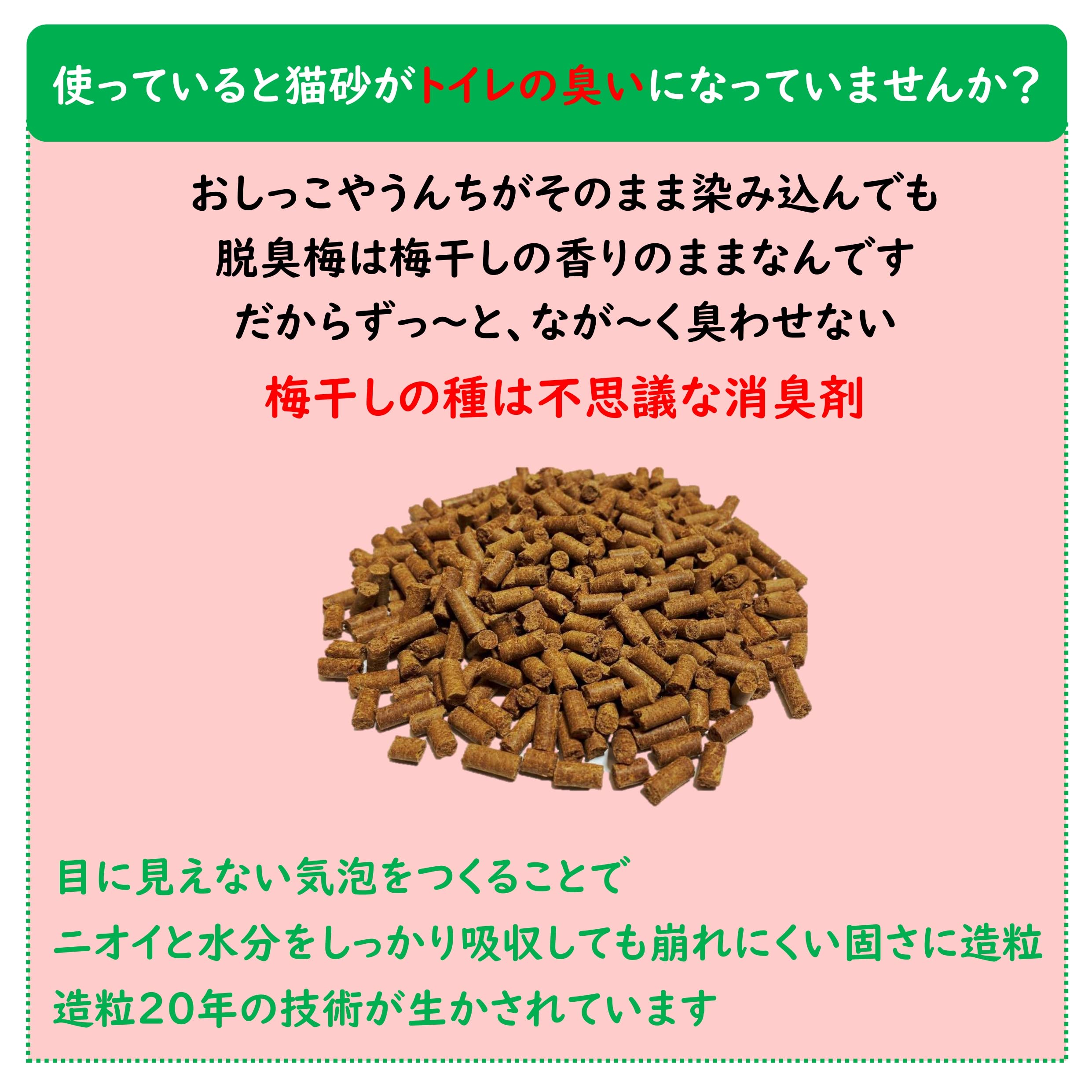 ・梅干しの種を再利用。 ・抗菌剤、香料などの化学物質不使用でペットに安心。 ・追加するだけ!長期間入れ換えなし。 ・大粒だから飛び散りにくい。 ・燃えるごみとして処理できる。 ・家庭臭まで脱臭でお部屋が毎日快適。