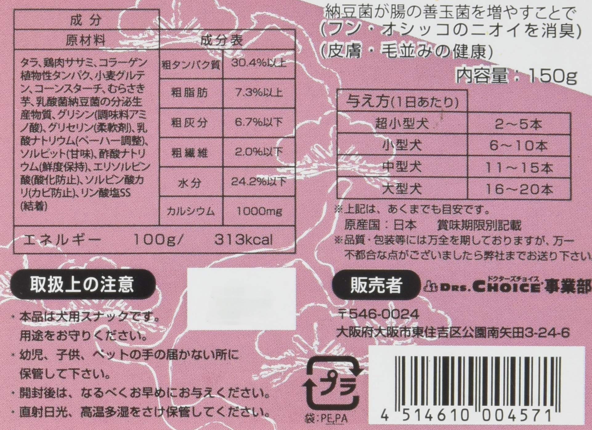 【原材料】 タラ 鶏肉ササミ コラーゲン 植物性タンパク 小麦グルテン コーンスターチ 紫いも 乳酸菌 納豆菌の分泌生産物質グリシン※1 グリセリン※2 乳酸ナトリウム※3 ソルビット※4 酢酸ナトリウム※5 エリソルビン酸※6 ソルビン酸カリ※ 7リン酸塩SS※8 ※1.調味料アミノ酸 ※2.柔軟剤 ※3.ペーハー調整 ※4.甘味 ※5.鮮度保持 ※6.酸化防止 ※7.カビ防止 ※8.結着