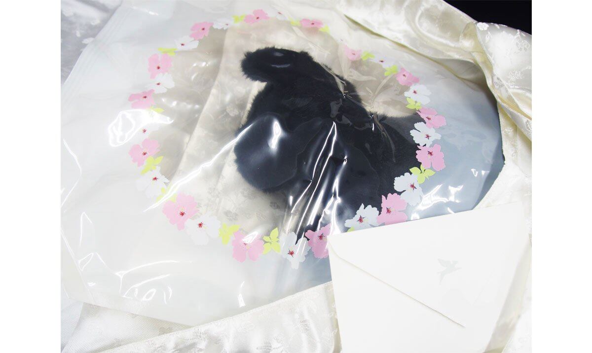 「天使のつばさ」はペット専用の柩です。衛生面に特化して開発された特殊素材を使用しているので、ウイルス感染や臭いもれの心配がありません。従来の柩と違い、衛生的にペットを室内に安置できます。