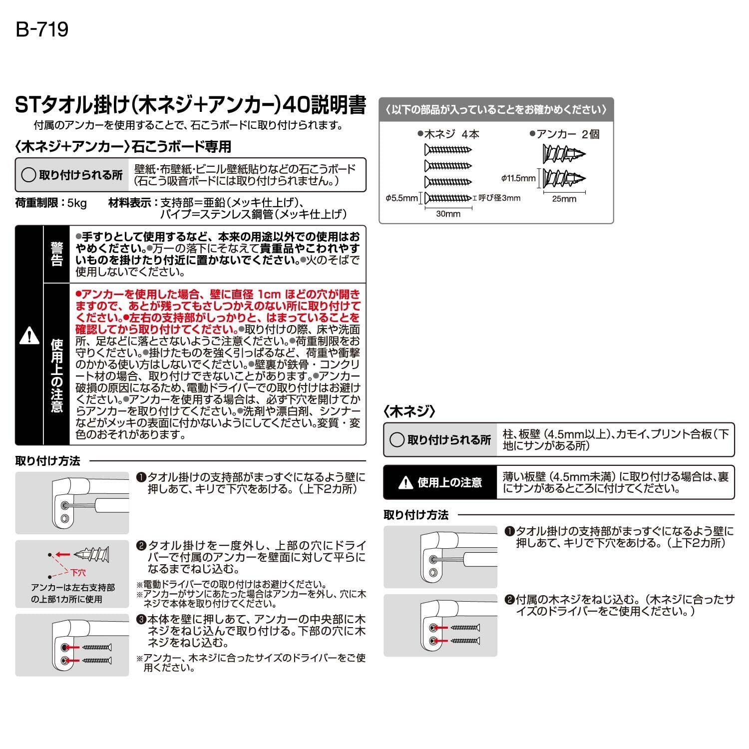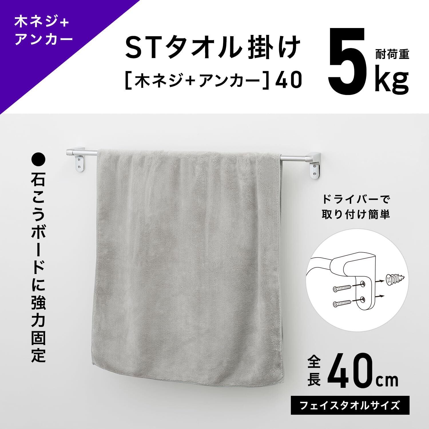レック ストロング タオル掛け (タオルバー) 木ネジ+アンカー 40㎝