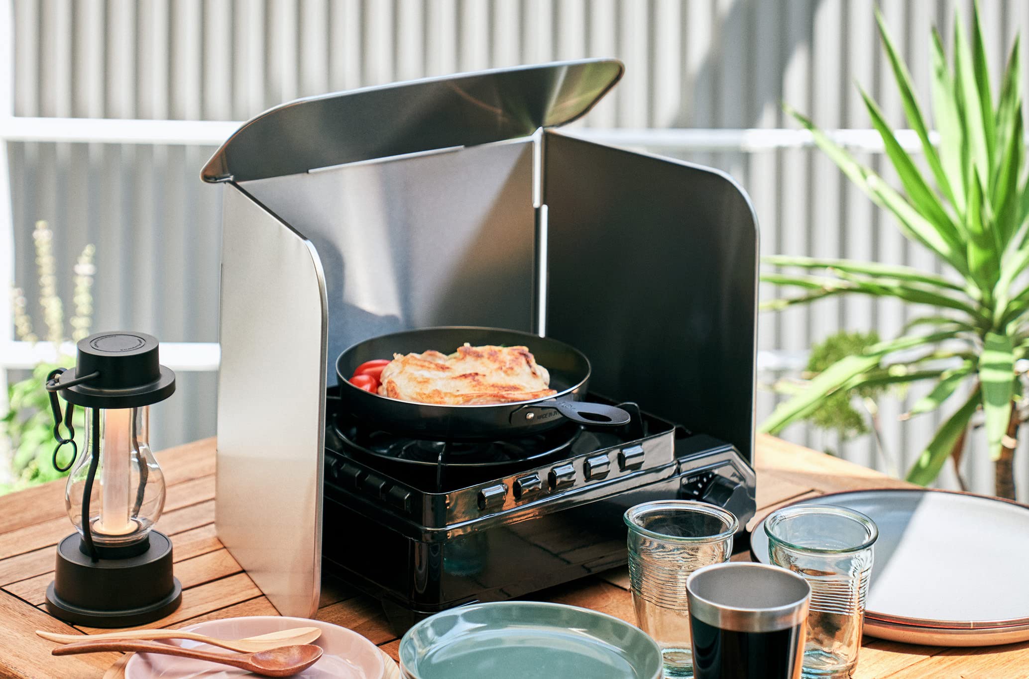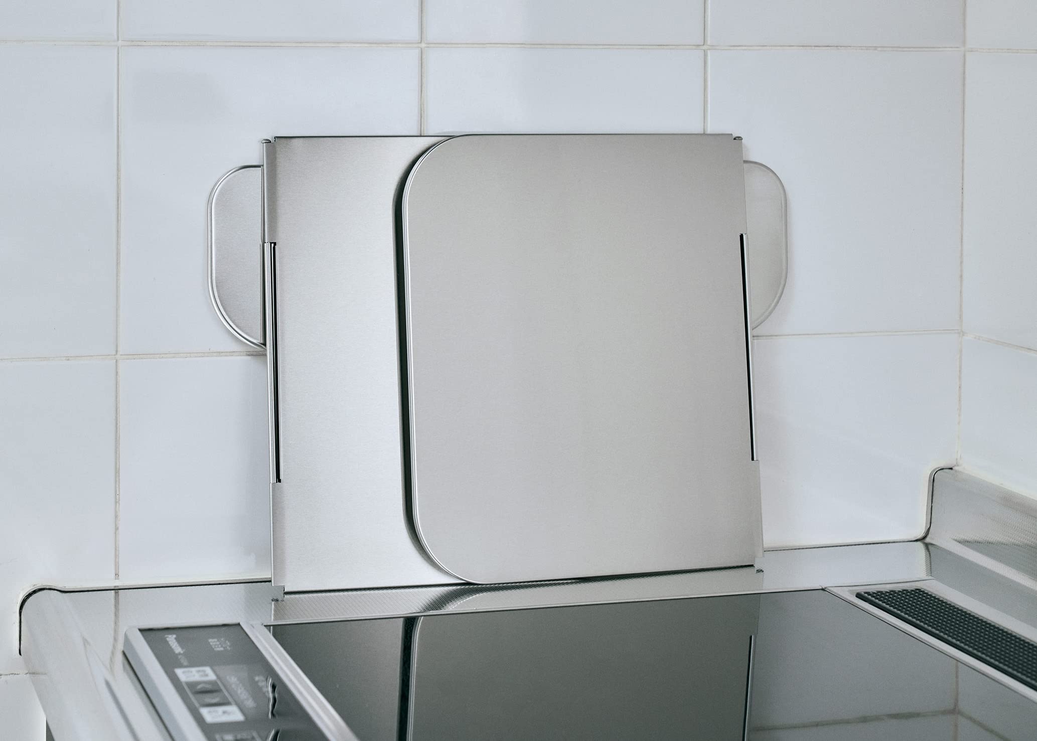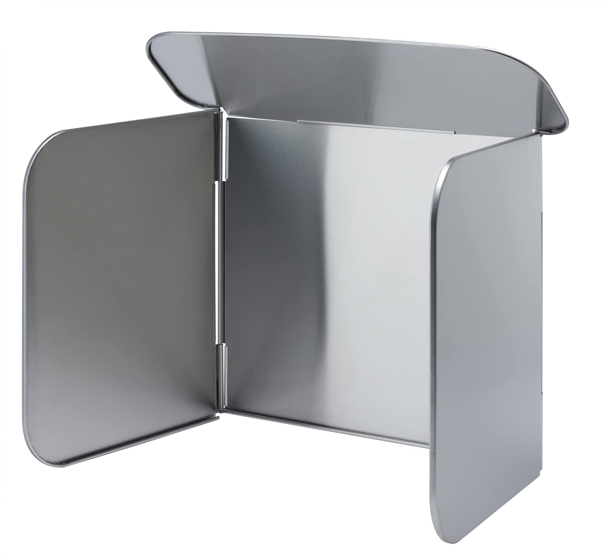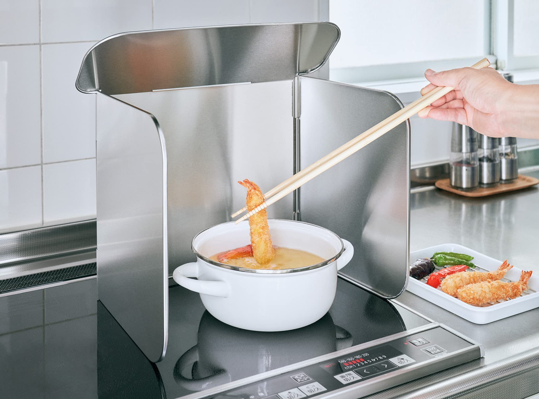 3面ガード+上面ガードで周囲への油ハネをしっかり防ぎます。使わない時は折りたためるので場所をとりません。分解できるので洗いやすく、食洗機にも使用できます。コンロの風除けとしても使用できるのでアウトドアでも使えます。