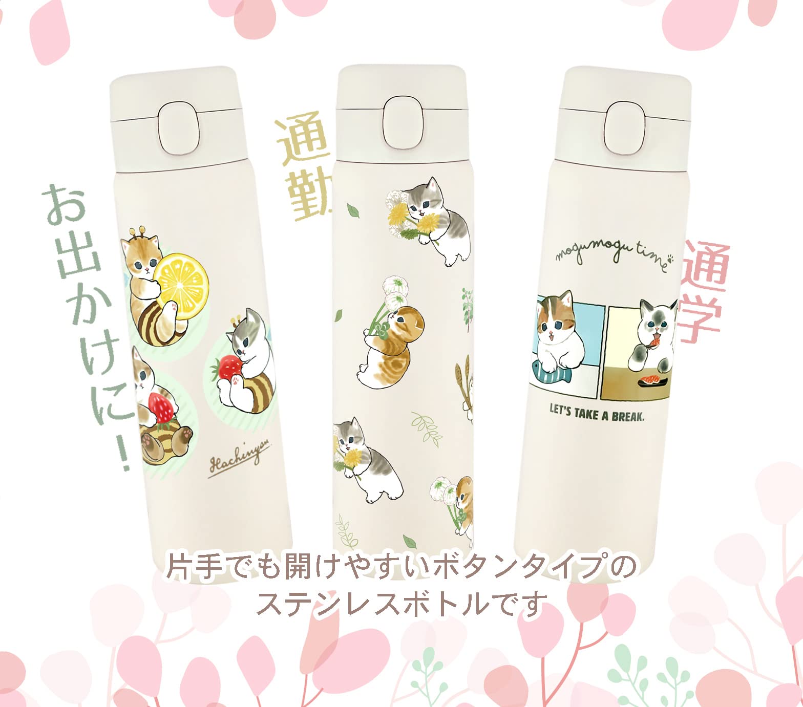 猫愛があふれる「もふもふ」な猫のイラストを生み出す作家ぢゅのデザインが特徴の使いやすいワンプッシュタイプのステンレスボトル。