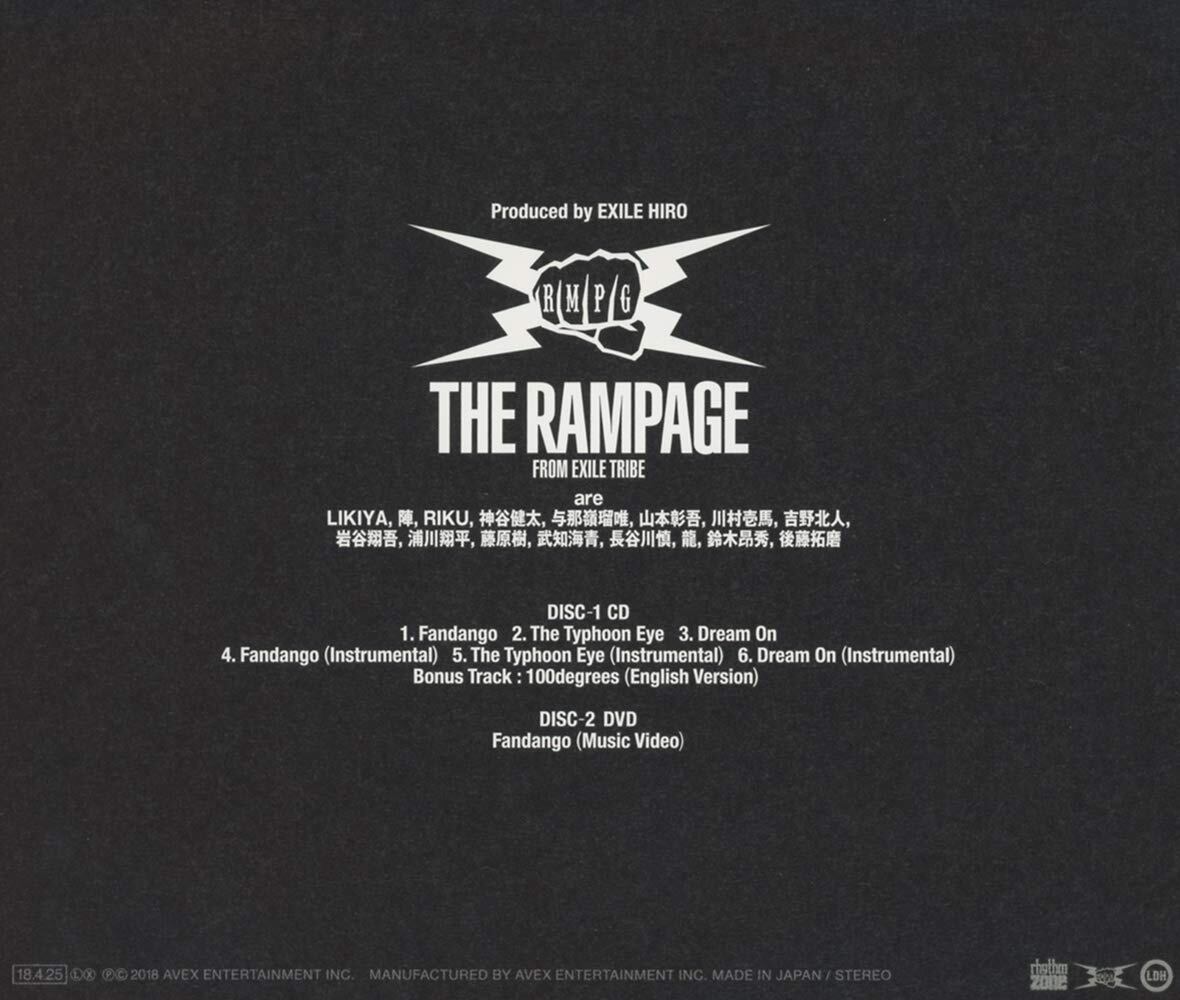 デビュー1周年を迎えてさらに勢いに乗るTHE RAMPAGEが放つ新曲「Fandango」! 世界的なトレンドであるラテンミュージックをTHE RAMPAGE流のダンスナンバーに昇華。 重厚なビート・情熱的な旋律の上で、ヴォーカリスト3名の艶やかな歌唱が冴えわたる。 “活気ある舞曲"から転じて"大騒ぎ"を意味するタイトル「Fandango」の通り、聴く者の心に火を点け、どこまでも熱くする! ■収録内容 CD収録内容※2形態共通 1.Fandango 2.The Typhoon Eye 3.Dream On 4.Fandango (Instrumental) 5.The Typhoon Eye (Instrumental) 6.Dream On (Instrumental) [Bonus Track]100degrees (English Version) ■DVD収録内容※CD+DVDのみ ・ Fandango (Music Video)