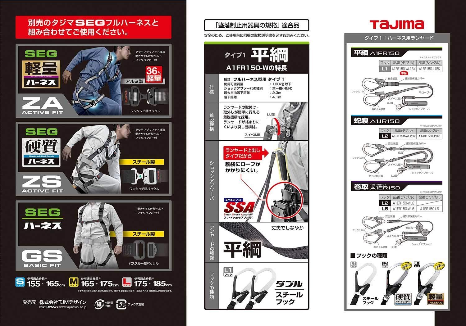 タジマ 新規格安全帯 ハーネス用平ロープ式ダブルランヤード 丈夫でしなやかな平ロープ 高耐久スチールフックL1 ランヤード長150cm ランヤード上分岐で腰周りを邪魔しない ショックアブゾーバは固定ベルト付き A1FR150-WL1BK