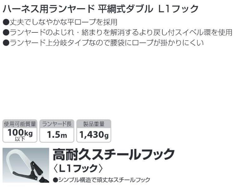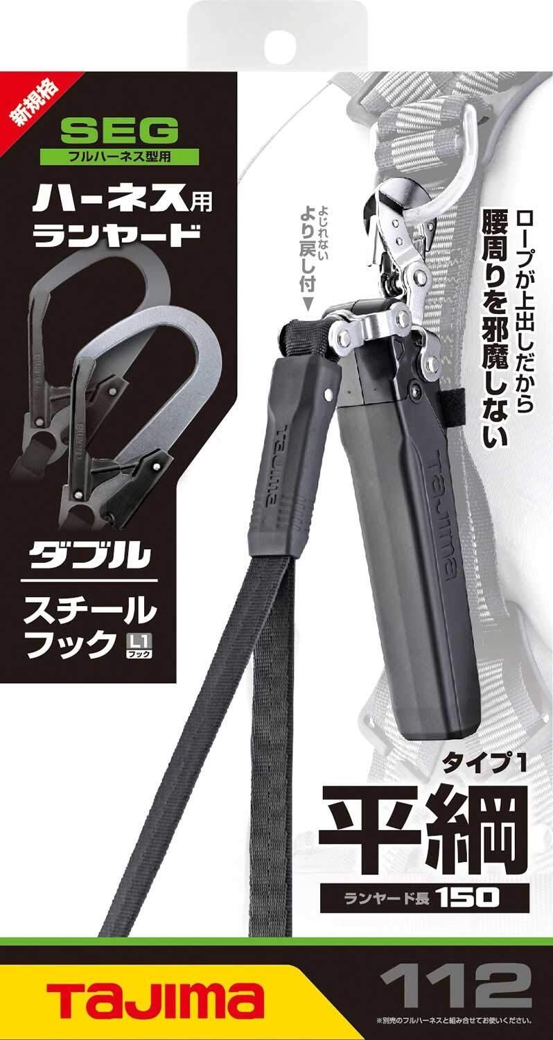 【限定大特価】タジマ 新規格安全帯 ハーネス用平ロープ式ダブルランヤード 丈夫でしなやかな平ロープ 高耐久スチールフックL1 ランヤード長150cm ランヤード上分岐で腰周りを邪魔しない ショックアブゾーバは固定ベルト付き A1FR150-WL1BK | ももくま屋さん