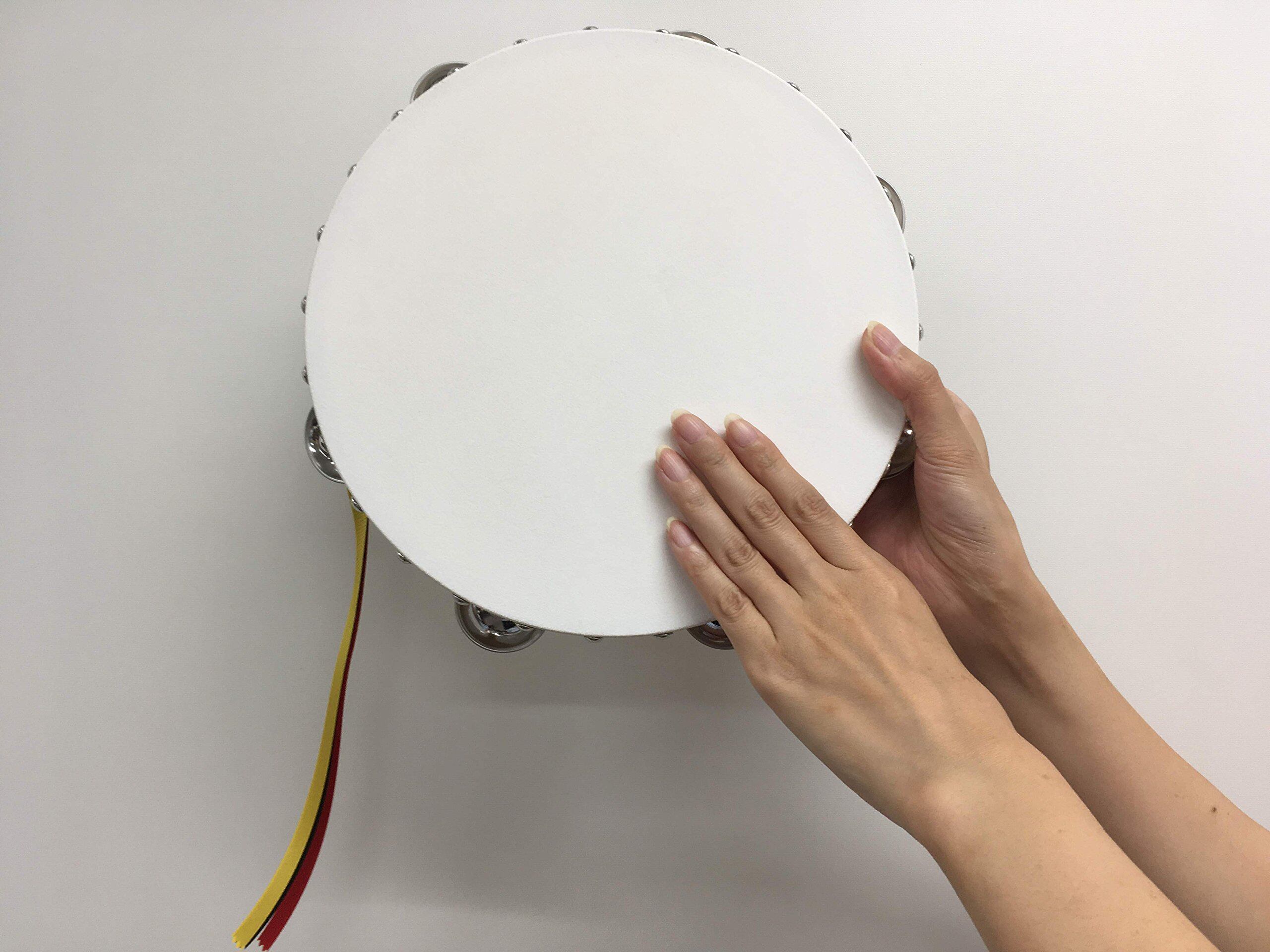 野上木工 ヤマヨ タンバリン 24cm クリア(木目・白枠) 牛革付 スズ(ジングル)7穴 3色リボン付 0200007