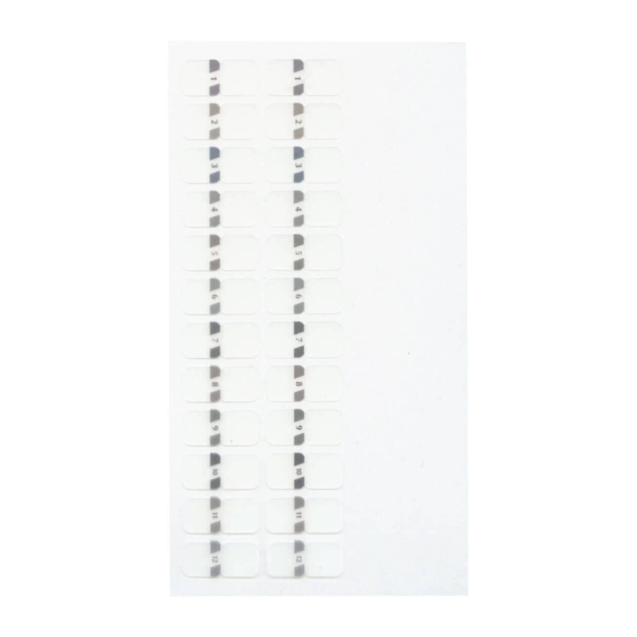 手帳をきれいに使いたい人にオススメの、チラッと見えるインデックスシール。。はみ出しが通常のものより少ない2.5mm幅で、手帳のカバーからはみ出しません。ずれても貼り直しできる再剥離タイプで、記入内容を隠さない半透明シールです。利用頻度が高い1~12の数字が各4枚入り。用途に合わせてたっぷり使えて、細かな仕分けに最適です。。・2シート(48。枚)入。・台紙の大きさ:横75×縦180(mm)。・シール1片の大きさ(2つ折時):横9mm×縦19(mm)。。サイズ:縦=140mm 横=75mm 。