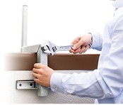 コンクリートフェンスを挟む圧接板の片方が回転することで、コンクリートフェンスと手すりのすき間からアングル部を通して簡単に取り付けられます。