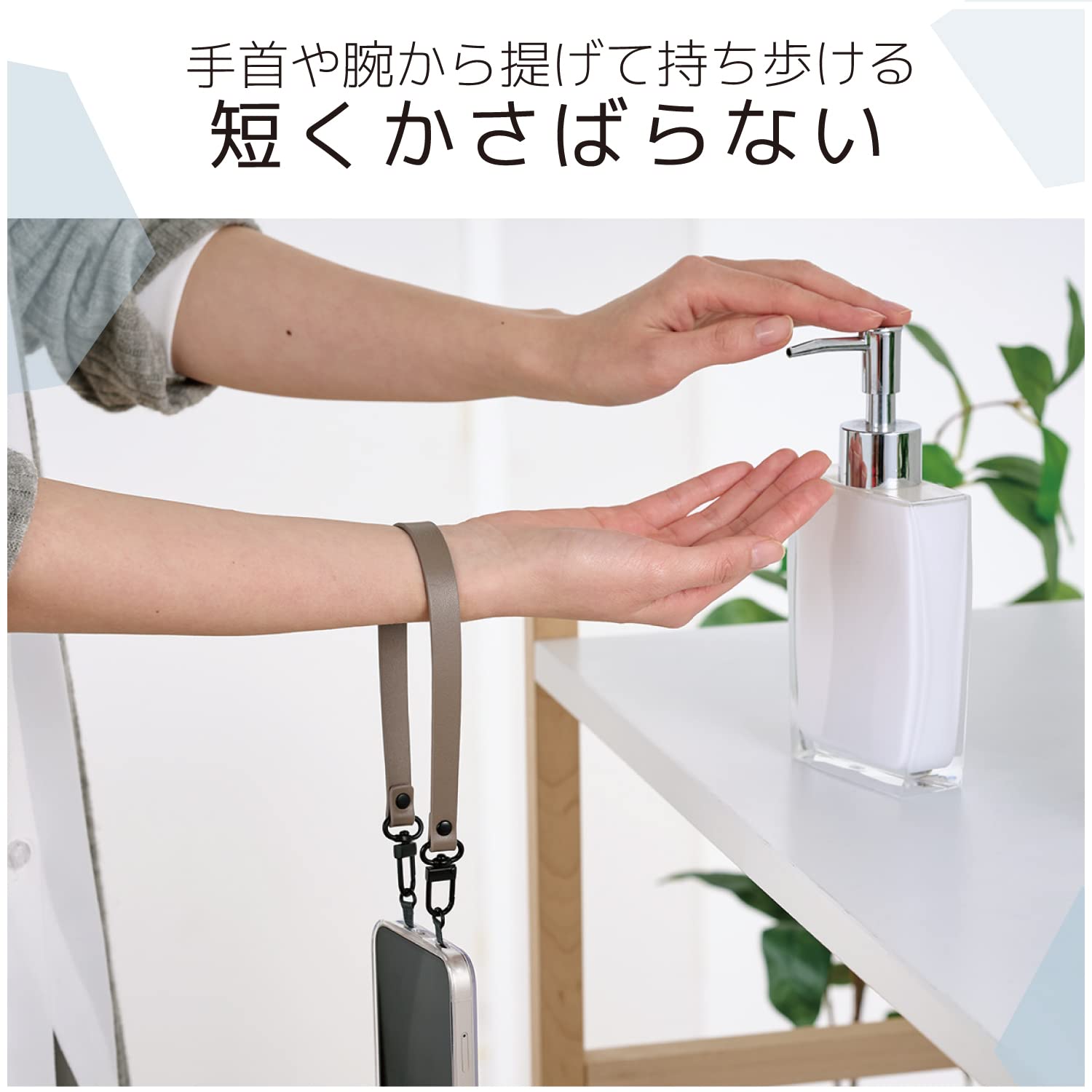 手首や腕から提げて持ち歩けるので、両手がふさがらずいつでもサッとスマートフォンの操作ができます。