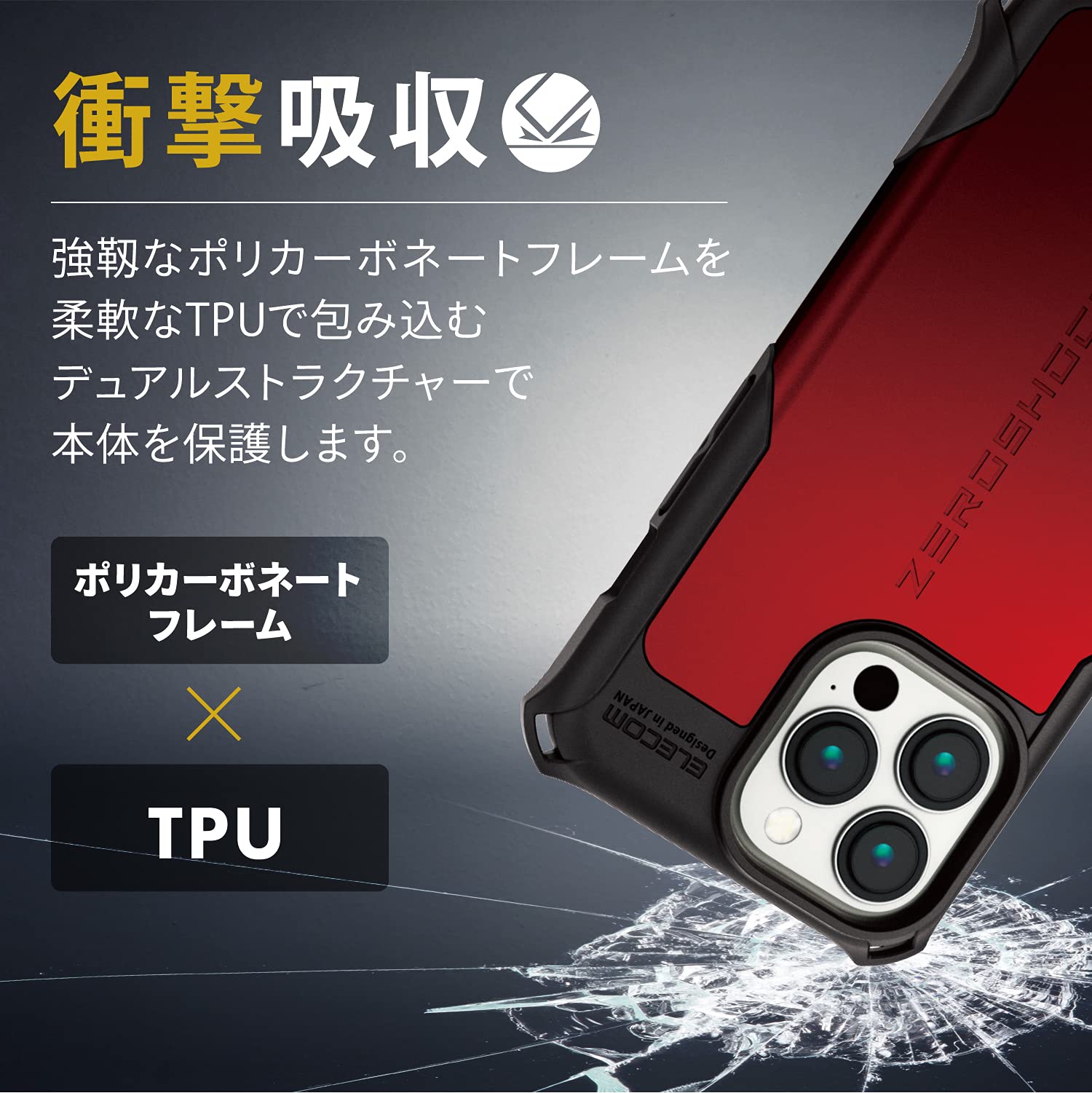 ■6つの衝撃吸収構造で機器本体を衝撃から守るiPhone 13 Pro用ZEROSHOCKケースです。 ■最も大きな衝撃が予想される四つ角にダンパーを設置し、効率的に衝撃を吸収します。 ■衝撃吸収に適したソフト素材と、それを外側から包むハード素材を使用したダブルレイヤー設計を採用しています。 ■本体背面が接するケース内側にも、衝撃吸収効率の高いハニカム構造を採用しています。