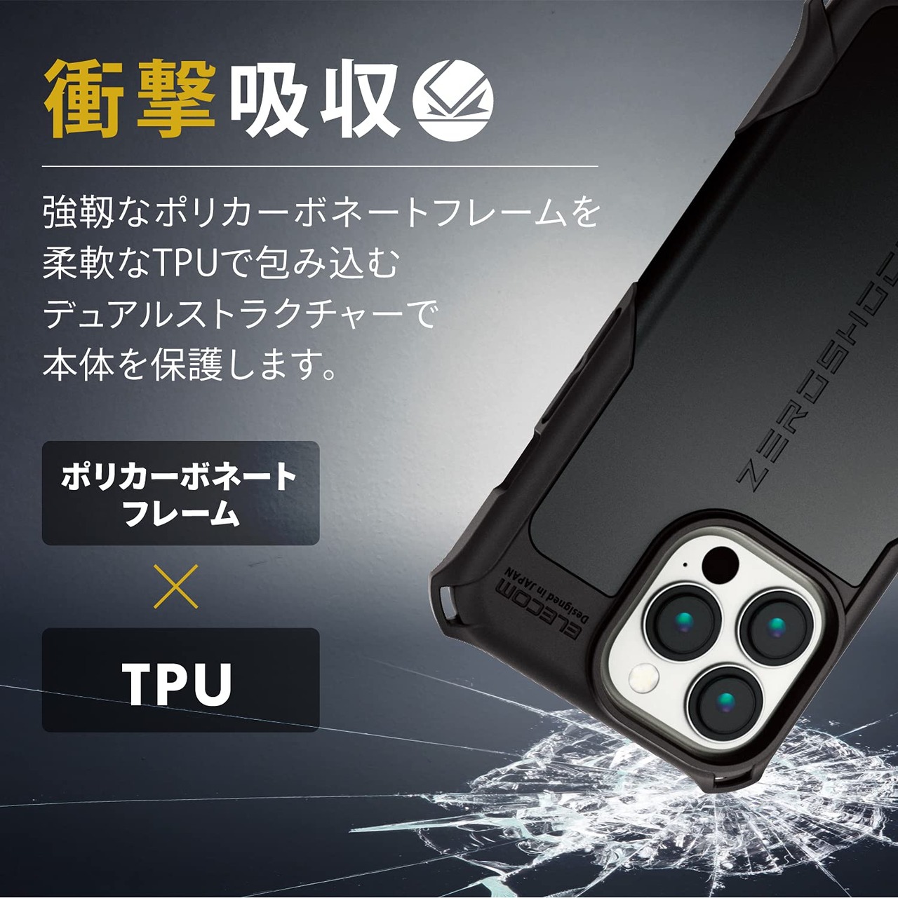 ■6つの衝撃吸収構造で機器本体を衝撃から守るiPhone 13 Pro用ZEROSHOCKケースです。 ■最も大きな衝撃が予想される四つ角にダンパーを設置し、効率的に衝撃を吸収します。 ■衝撃吸収に適したソフト素材と、それを外側から包むハード素材を使用したダブルレイヤー設計を採用しています。 ■本体背面が接するケース内側にも、衝撃吸収効率の高いハニカム構造を採用しています。