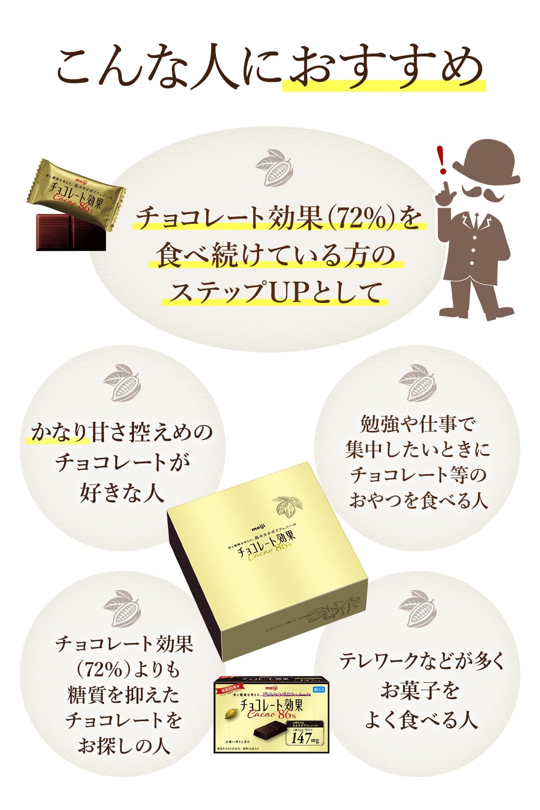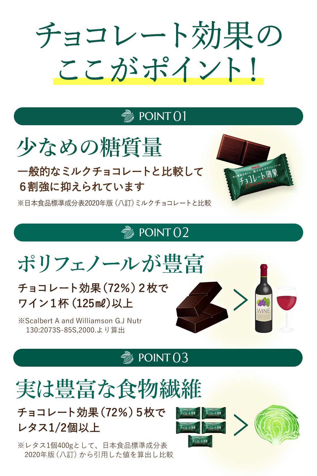 ・知っていますか?ポリフェノール1日摂取量の目安 一般的には、1日に200kcal程度の間食が適量(厚生労働省)だと言われていますので、 おいしく健康に食べたいなら1日3枚から5枚を目安に毎日コツコツ食べてみてください(約87kcal~約145kcal)。 ・はじめて食した際に苦みや濃さを感じる方は、まず2枚程度からスタートさせ少しずつ慣らしていくのがよいでしょう。 ・チョコレート効果86%には、1枚で147mg、5枚で735mgのカカオポリフェノールが含まれます。 ※過剰摂取は推奨しておりません