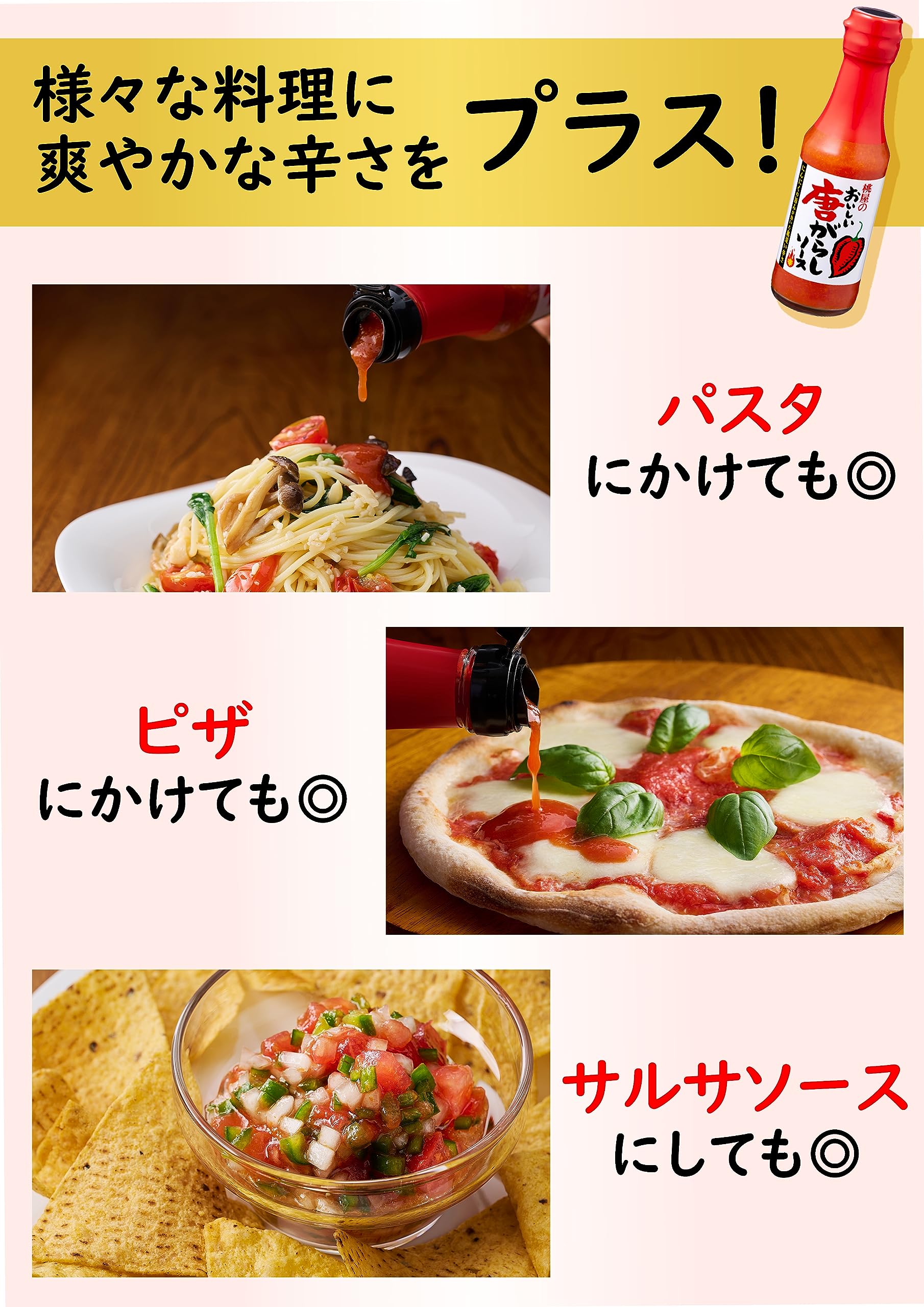 ■使い方:ピザ、パスタはもちろん、唐揚げやポテトフライなどの揚げ物、オムレツやハムエッグなどの卵料理など様々な料理の辛味付けに。また、サルサソースなどの調味料としてもお使いいただける、万能調味料です。