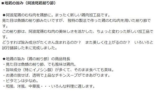 阿波尾鶏のむね肉で作られた削り節です。新しい鶏肉の加工品です。