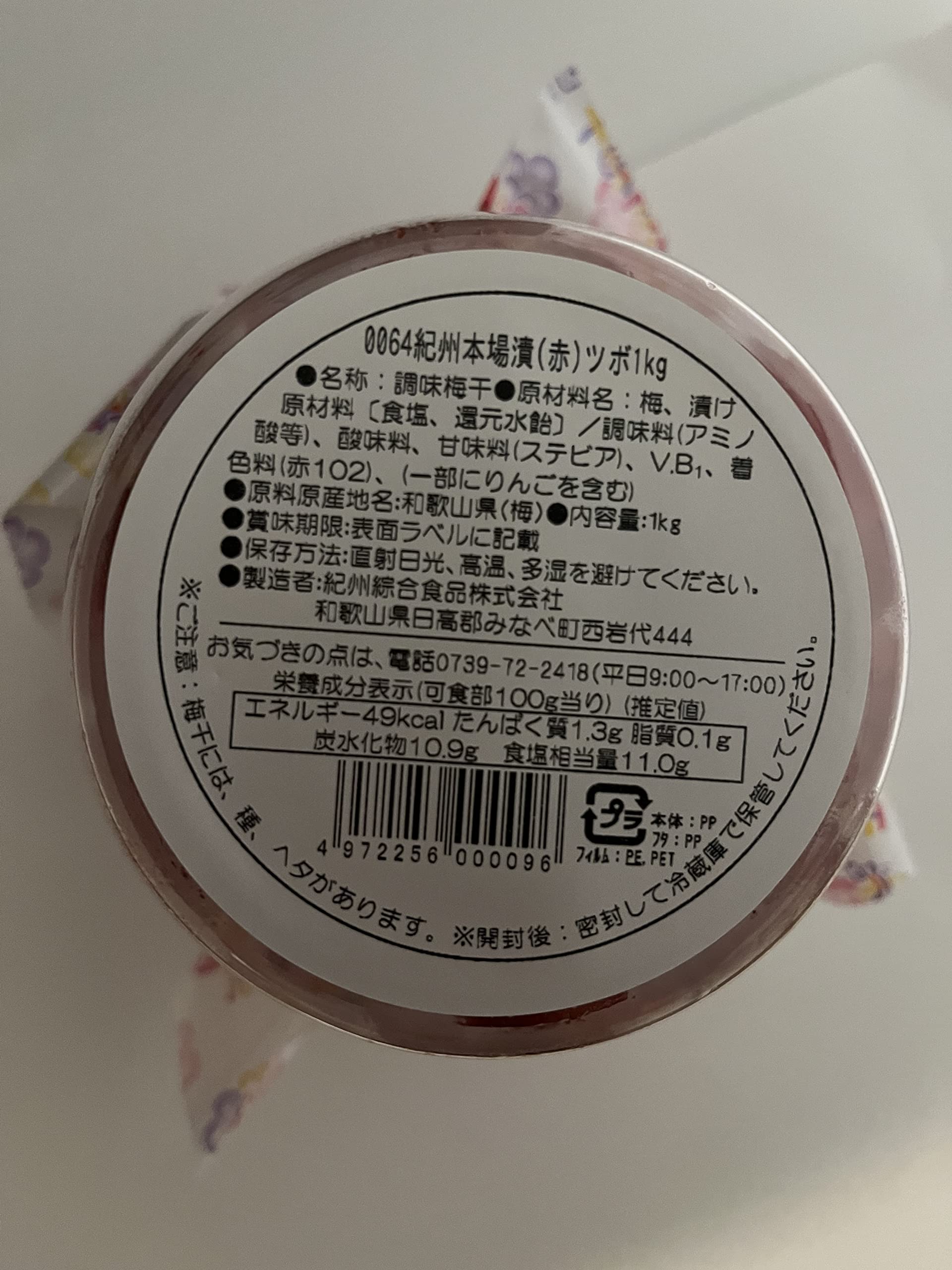原料原産地 和歌山県 原材料 梅 漬け原材料 [食塩]、調味料(アミノ酸等)、酸味料、甘味料 (ステピア)着色料(赤102)(一部りんごを含む)、V.B1 内容量 ツボ1kg 紀州綜合食品株式会社