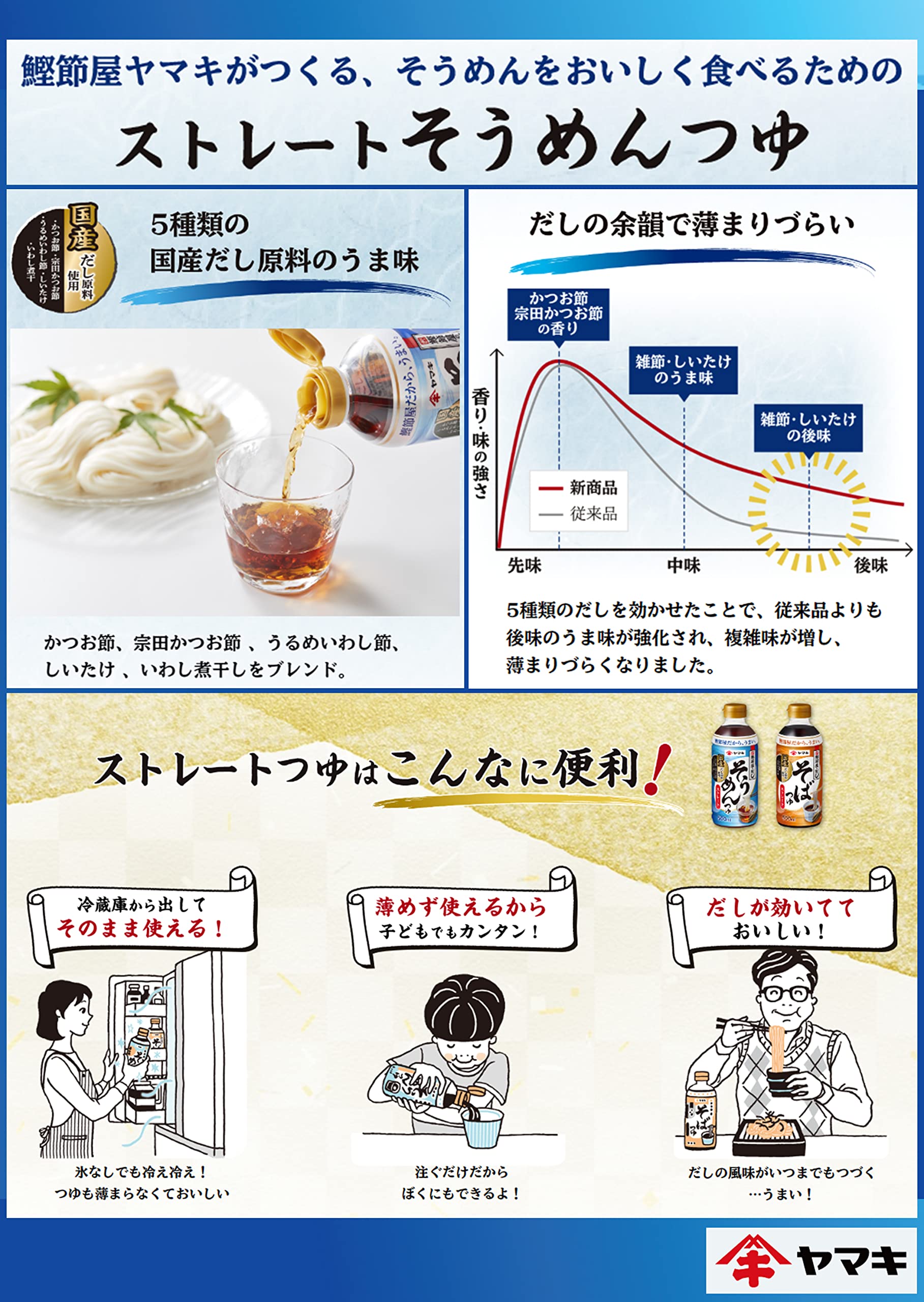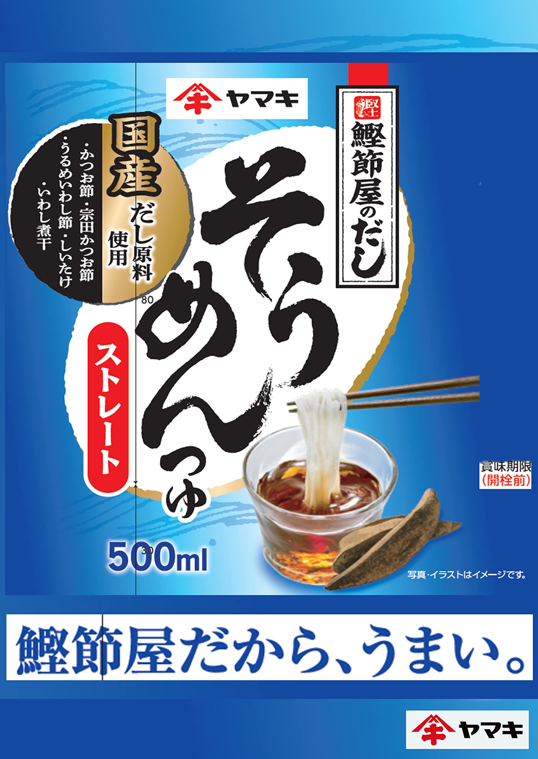 鰹節屋だから、うまい。国産だし原料を使用したストレートそうめんつゆ。鰹節屋だからできた、そうめんをおいしく食べるためのつゆに仕上げています。