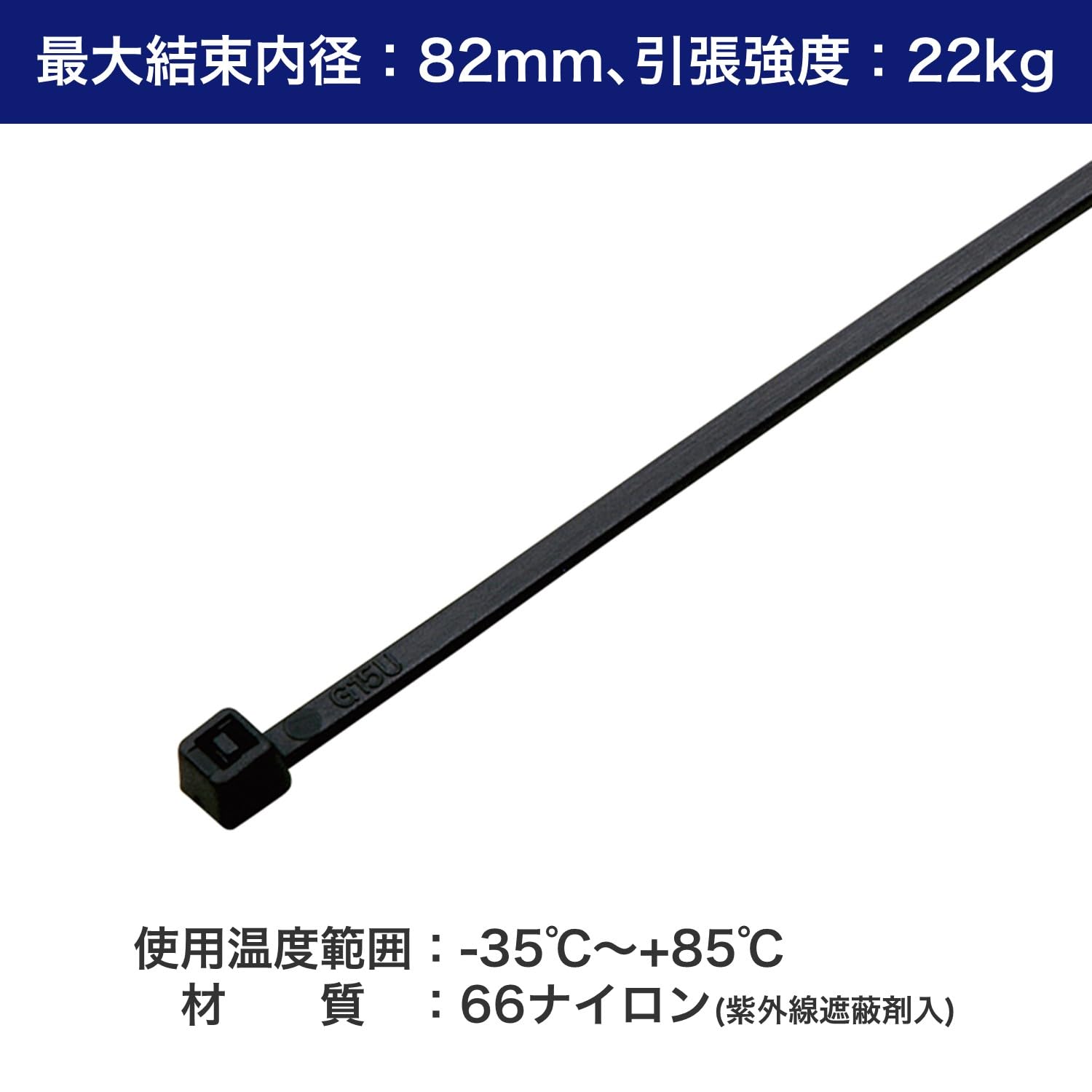 ■全長:300mm ■幅:4.5mm ■最大結束内径:82mm ■引張強度:22kg ■使用温度範囲:-35℃~+85℃ ■材質:66ナイロン(紫外線遮蔽剤入) ■100本入