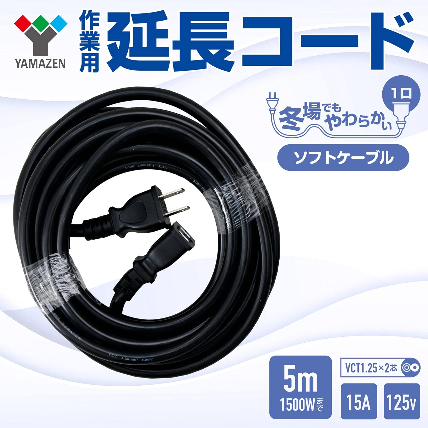 [山善] 延長コード 5m 1口 15A 125V 1500W ブラック ソフトケーブル 延長ケーブル 延長コンセント OAタップ 電源コード 電源タップ コードリール EC-S1505BK