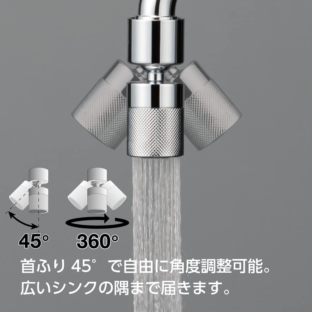 【首ふり自在で掃除に便利】首ふり角度45°で自在に水の方向を調整できます。シンクの広範囲に水が届いてお掃除に便利です。