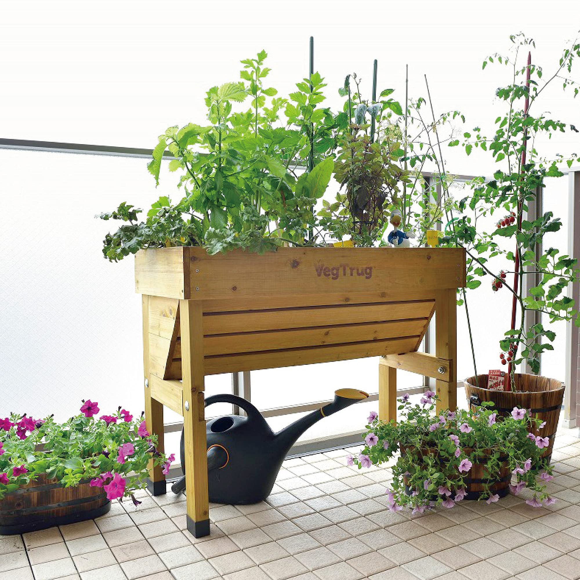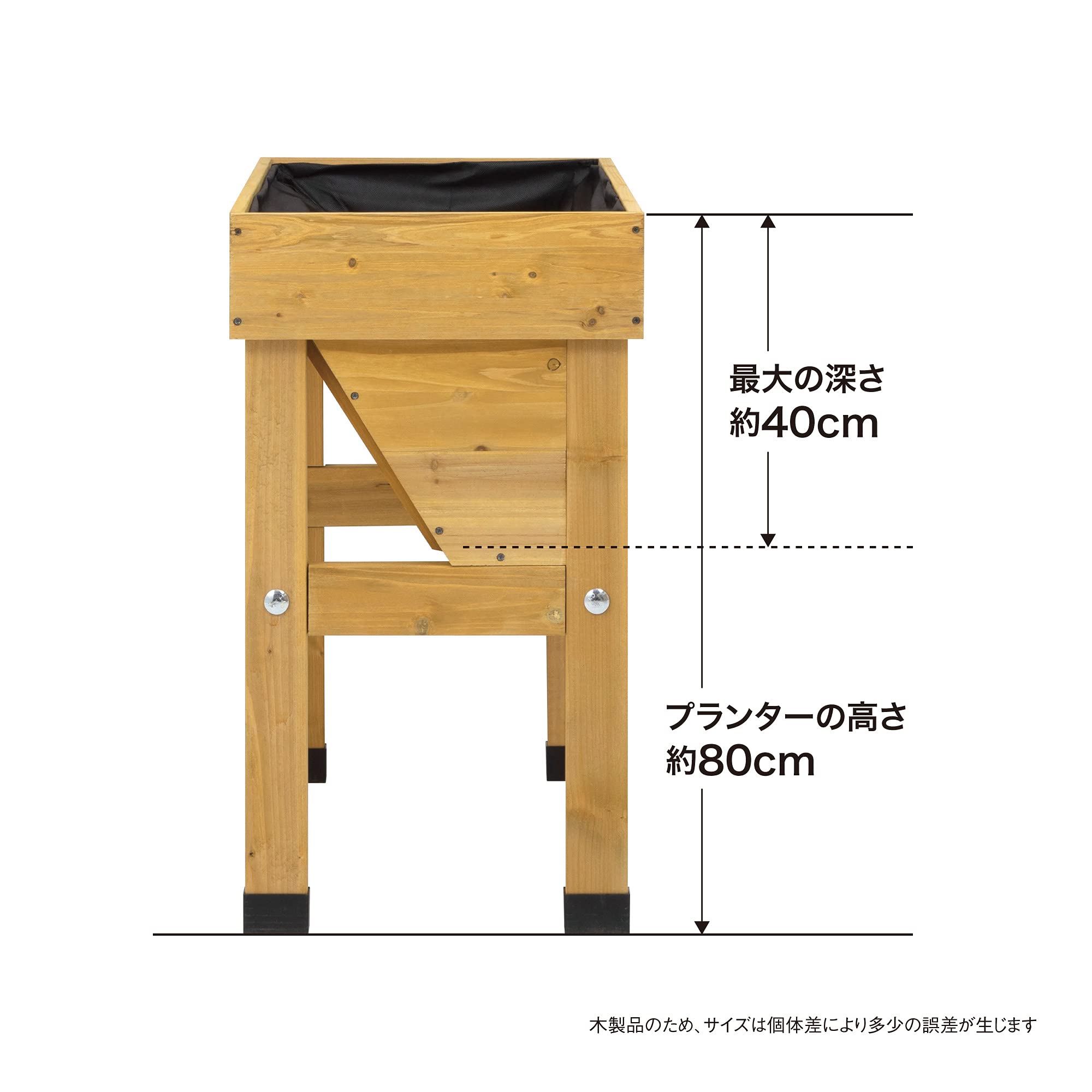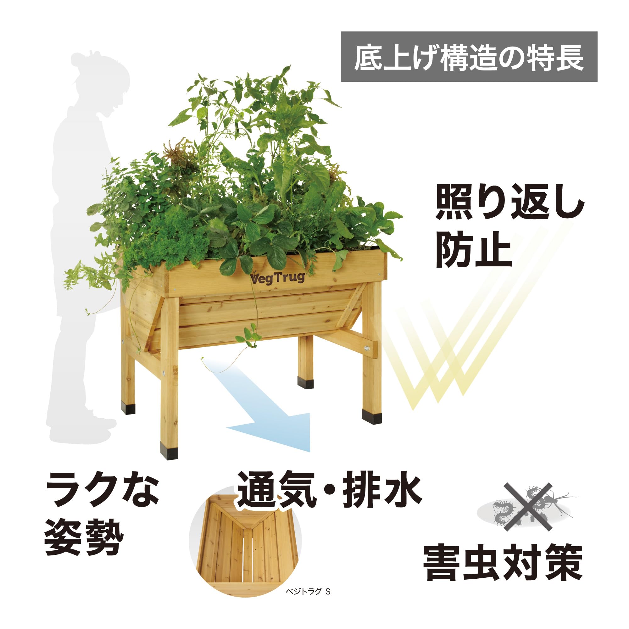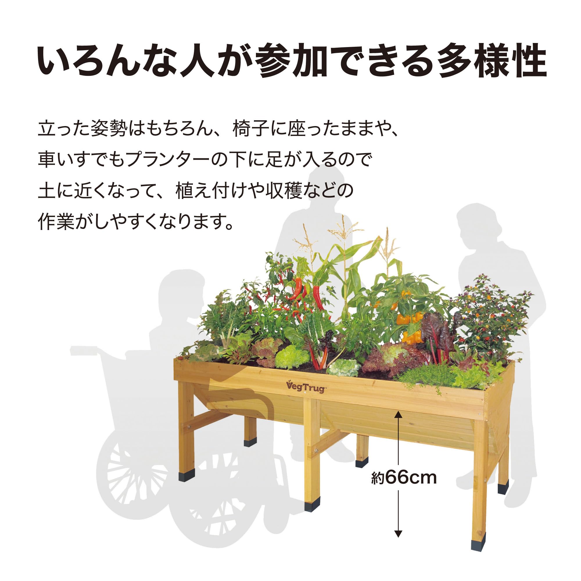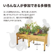 立った姿勢でお手入れがしやすく、椅子に座ったままでもプランターの下に足が入るので、植え付けや収穫などの作業がしやすくなります。