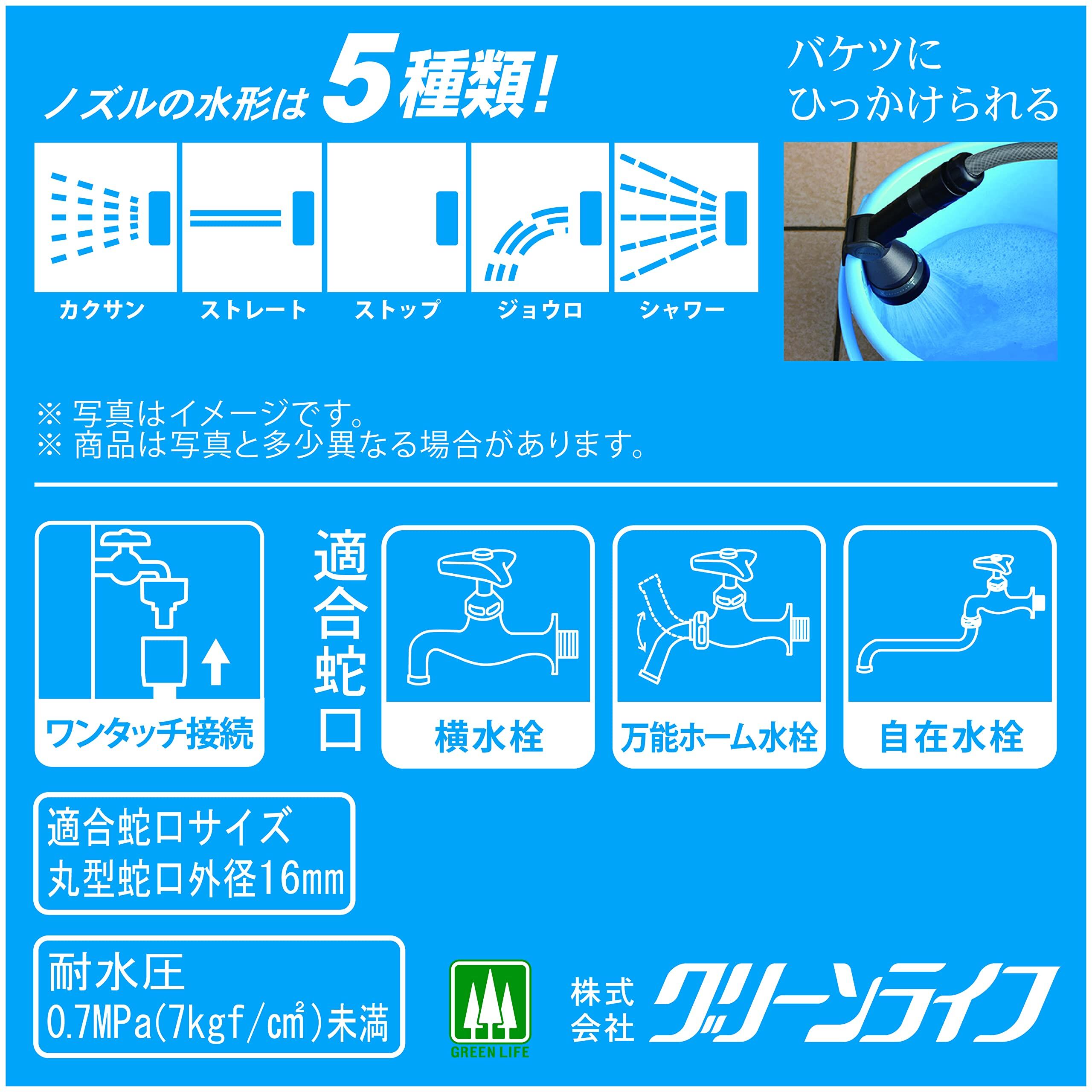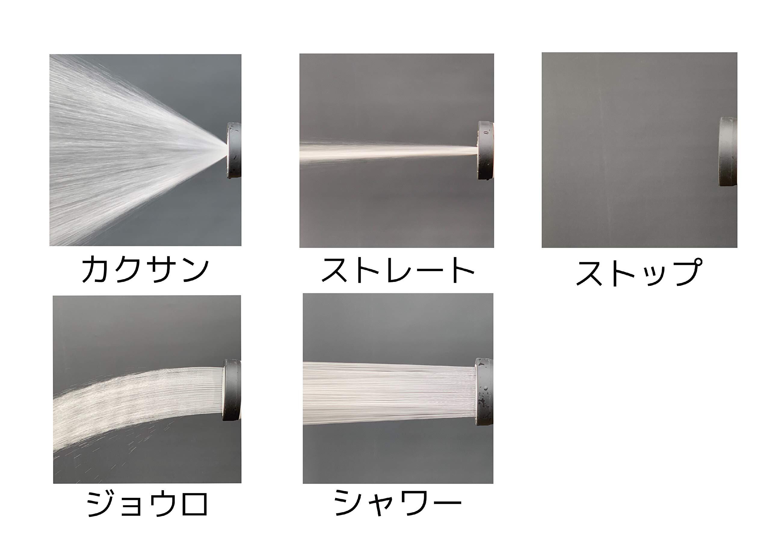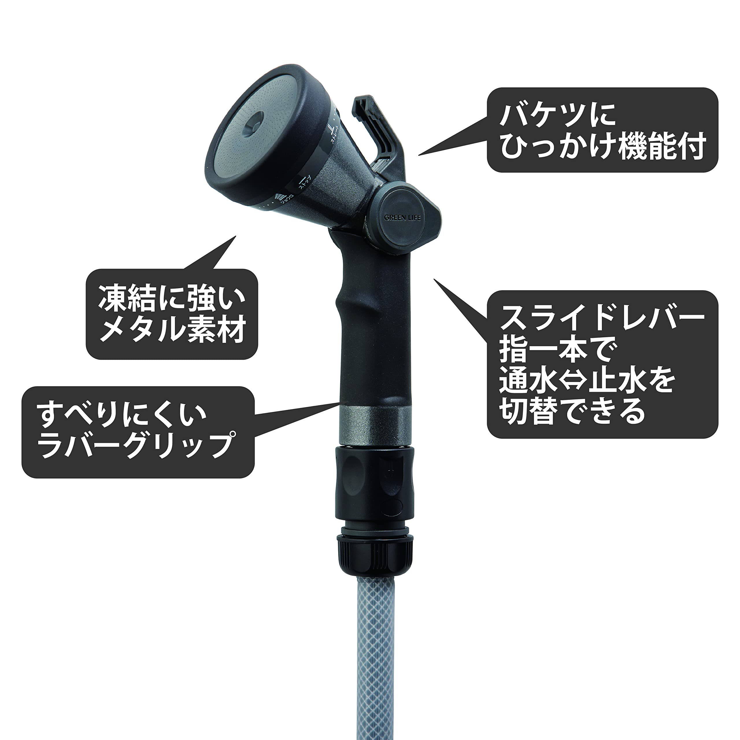 【片手で水量調節が可能】ノズルは、スライドレバーを操作して通水・止水します。スライドレバーでは水量を調節することも可能。散水用途に合わせ、4つの水形(カクサン、ストレート、ジョウロ、シャワー)と水量を調節してご使用くださいませ。
