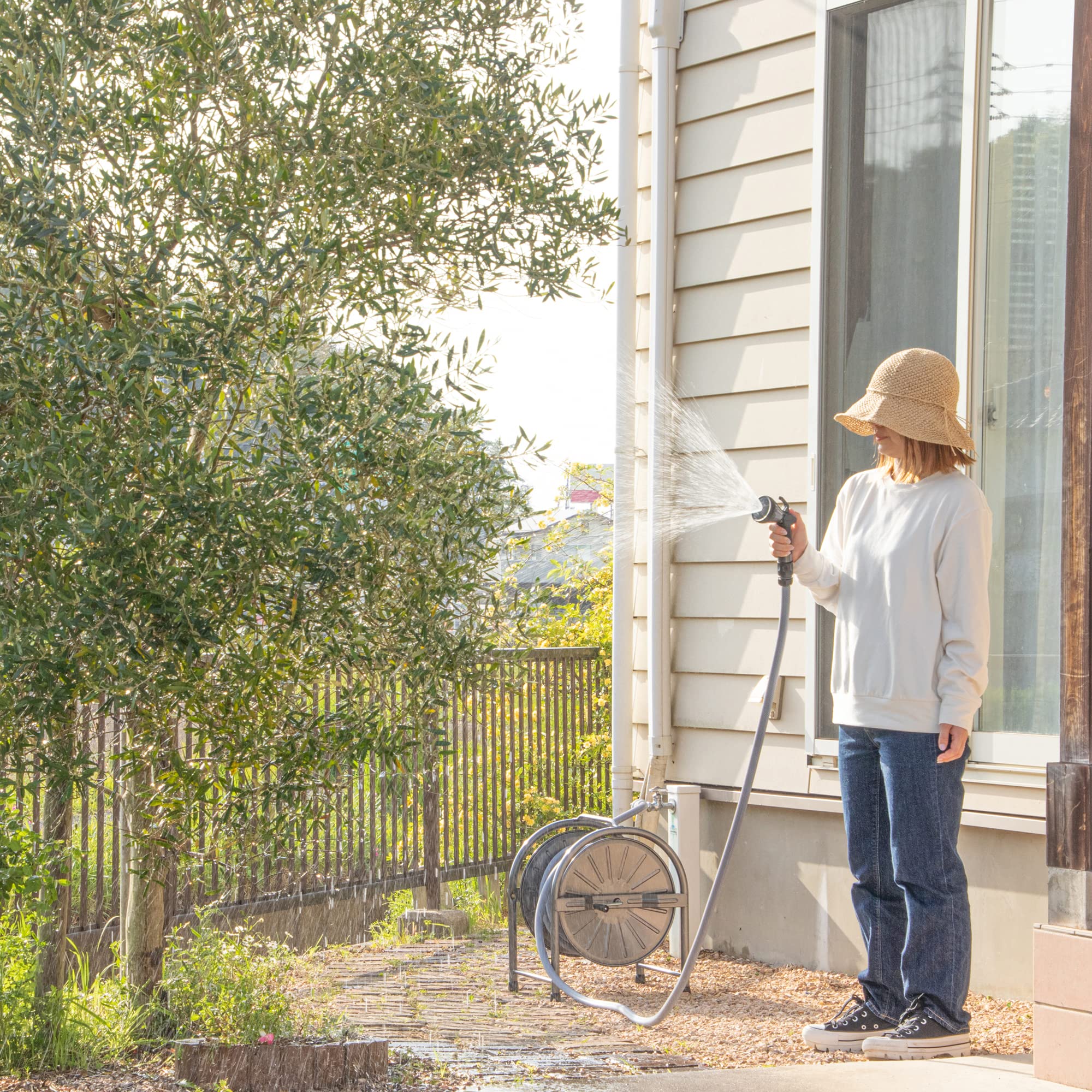 ねじれにくい、高密度ストリングス構造の内径15mmホースを使用。メタル製で耐久性が高く、散水作業に便利な"大水量ひっかけメタルノズル"を使用。高級感のあるメタリック塗装のグレーカラーでお庭や外壁に馴染むスタイリッシュなデザインです。