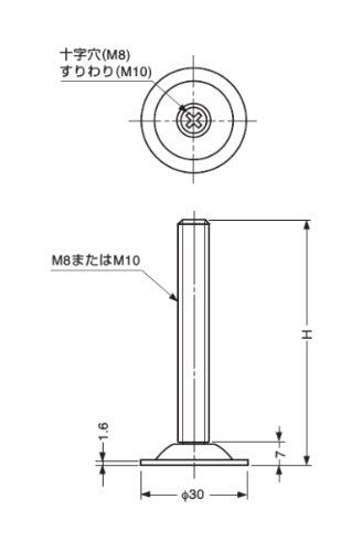 ドライバーで、ねじ部上面の十字穴(M8仕様)と、すりわり(M10仕様)を使って、高さ調整が可能