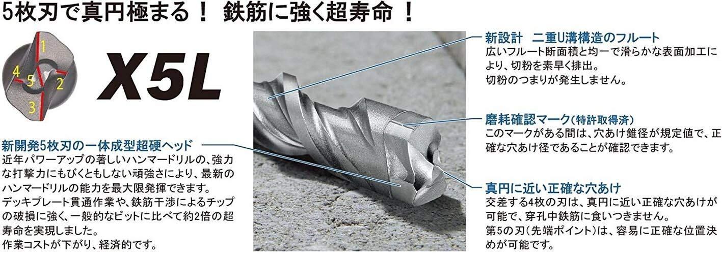 ●世界初の5枚刃の頑強な一体成型超硬ヘッドを採用。真円に近い穴あけと鉄筋干渉に強い超寿命を実現