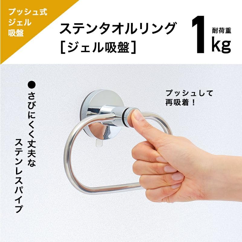 すごい吸盤 ステンレス タオルリング (耐荷重1kg) ザラザラ壁対応 密着強力ジェル 落下防止機能