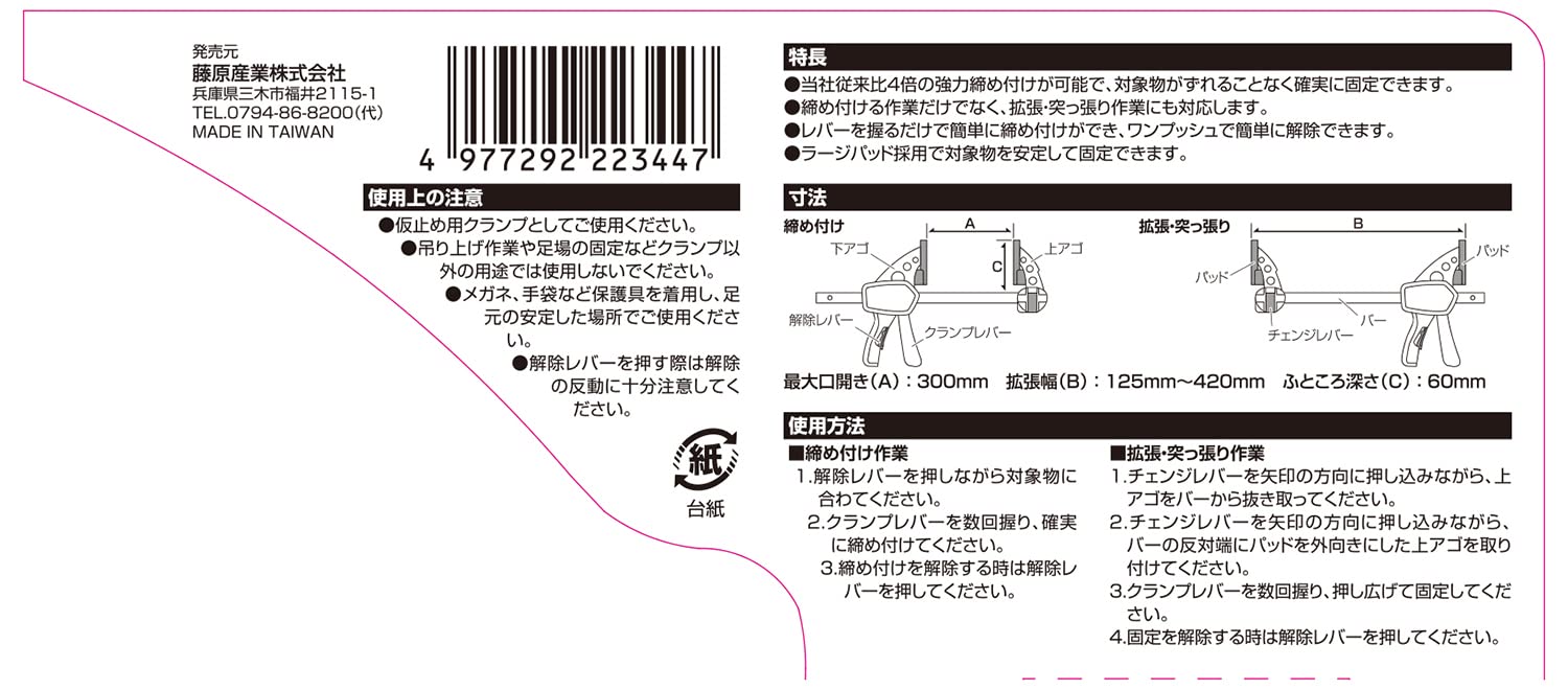 特徴:レバーを握るだけで強力クランプ、ワンプッシュで簡単にリリースできる