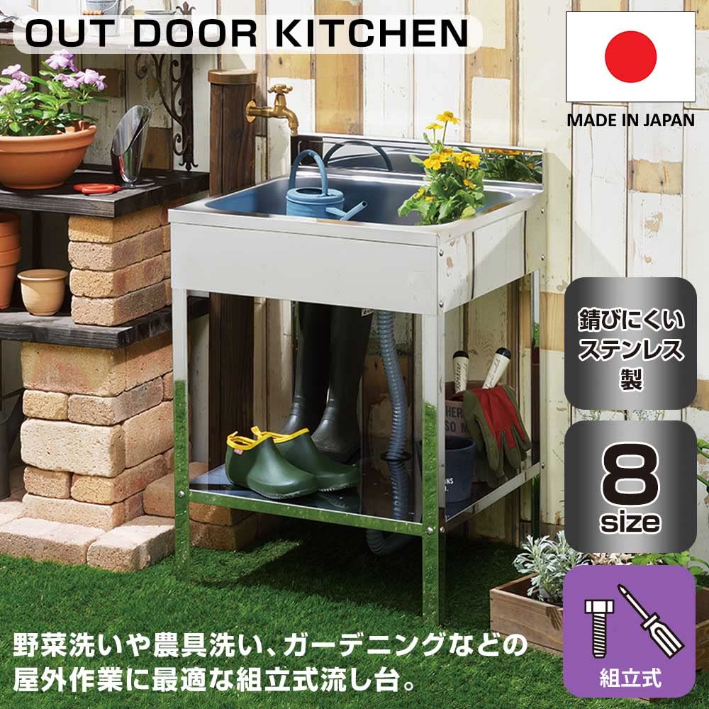 サンカ アウトドアキッチン オールステンレス製 錆びにくいガーデンシンク 幅85cm 永く使える長期寿命設計 水が飛散しにくい深型シンク 丸洗い可能 清潔 便利な棚板付き 日本製 屋外 流し台 アウトドア用 簡易 シンク ガーデンパン SK-00850