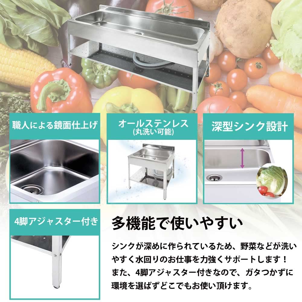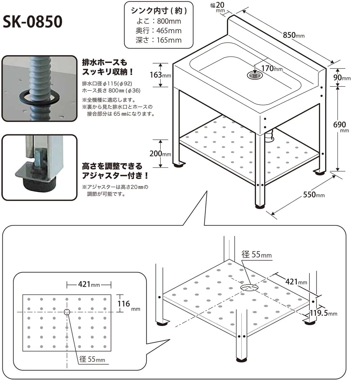 材質:本体・棚板:SUS430 パッキン:合成ゴム アジャスターネジ部:スチール アジャスター皿部:ポリエチレン 排水栓:ABS樹脂 ホース:塩化ビニール(80cm)