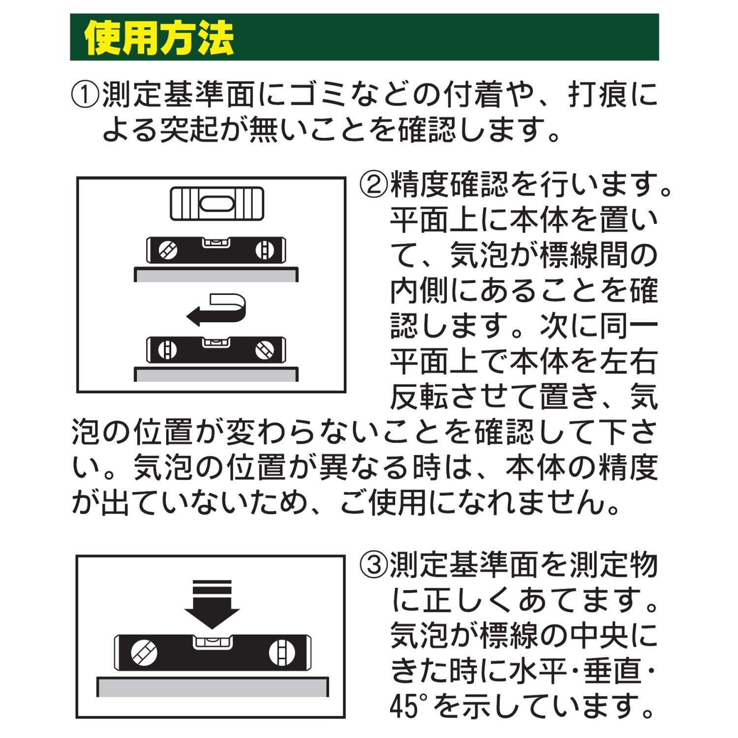 精度:水平気泡管±1.00mm/m=±0.0573度以内、垂直・45度気泡管±1.50mm/m=±0.0859度以内