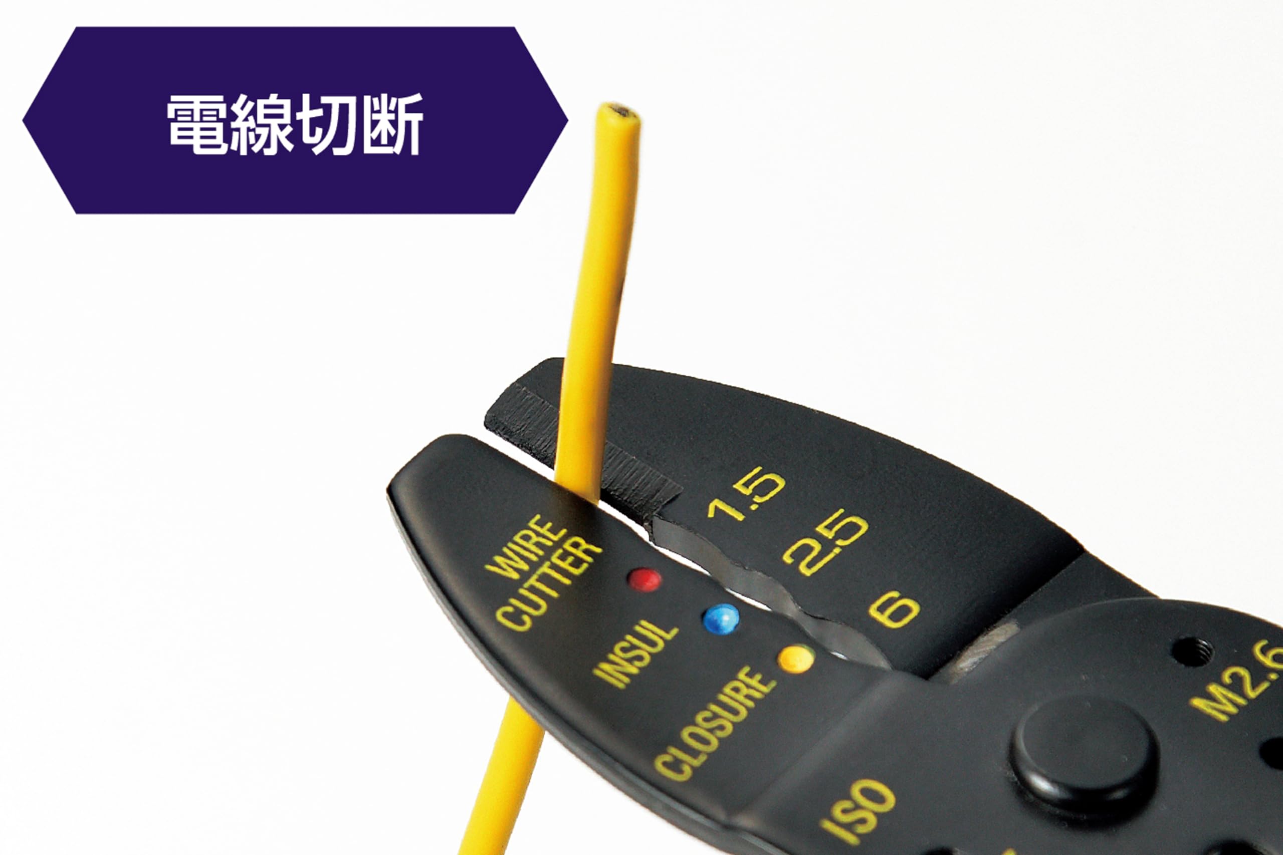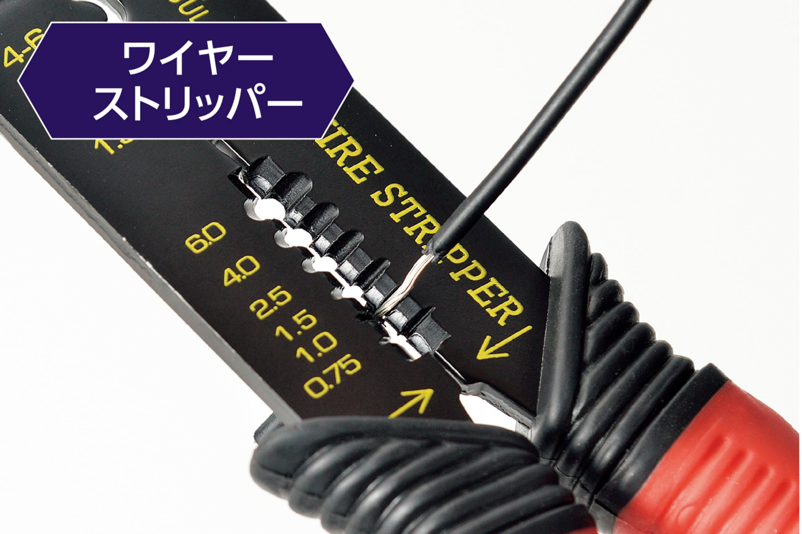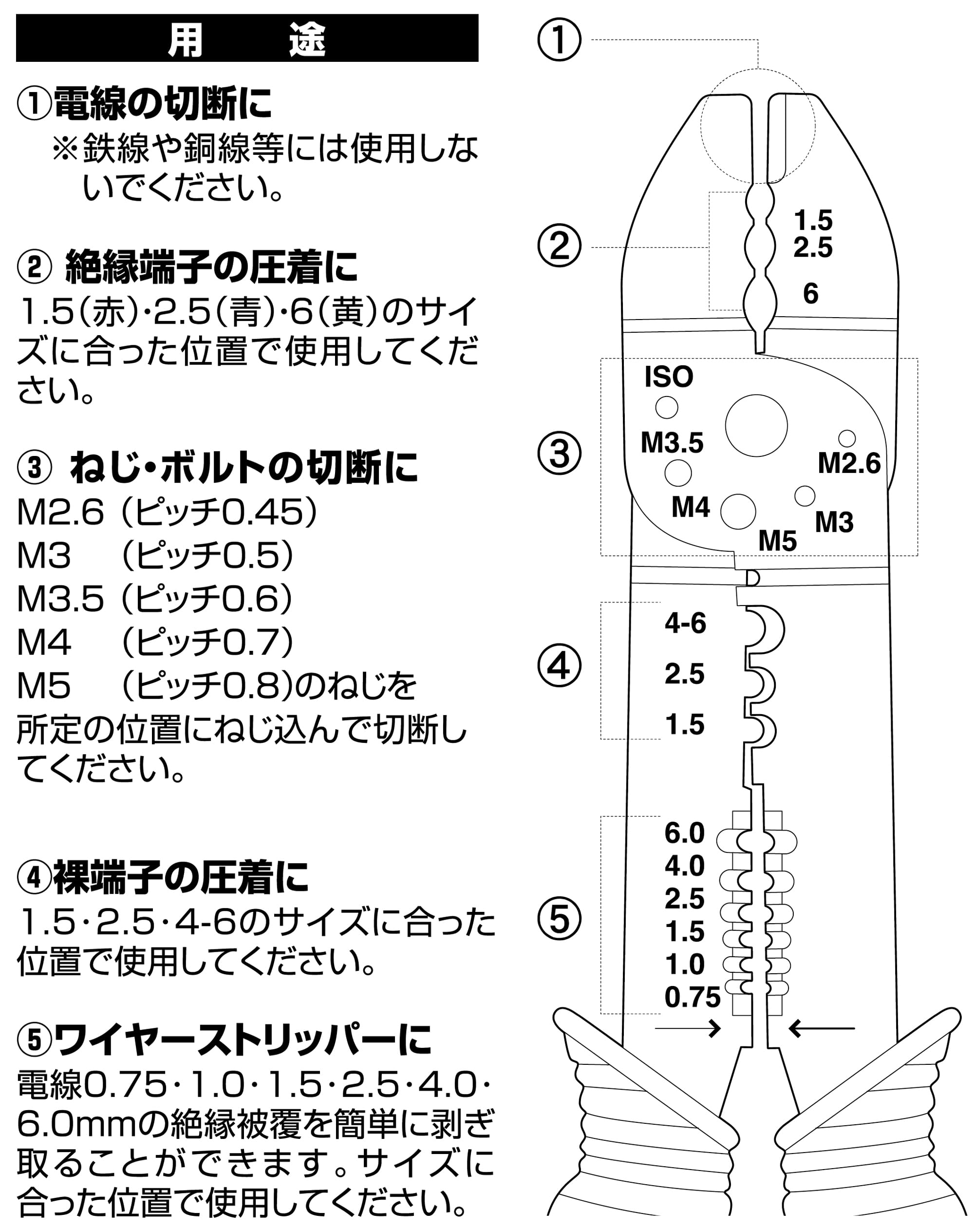 電線0.75・1.0・1.5・2.5・4.0・6.0mmの絶縁被覆を簡単に剝ぎ取ることができます。サイズに合った位置で使用してください。