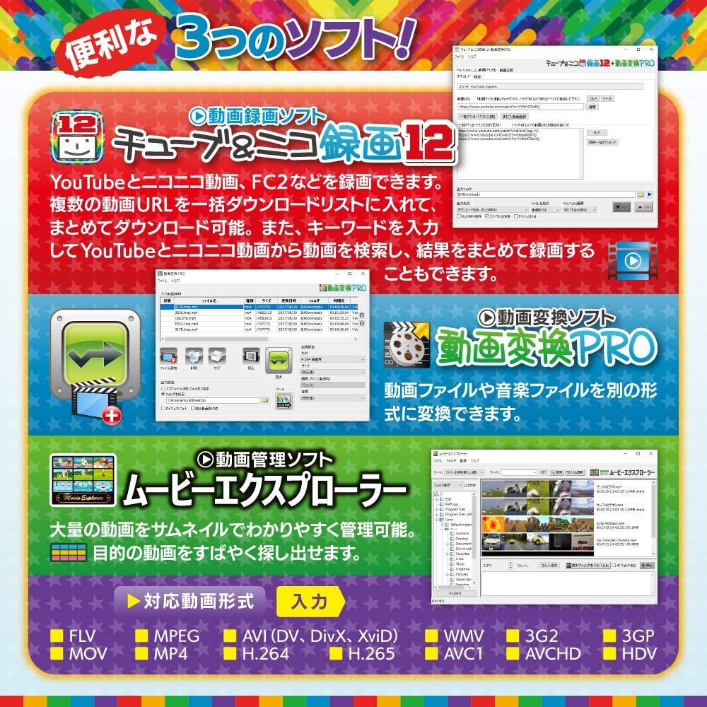 本製品は、YouTube、ニコニコ動画、FC2はじめ多くの動画サイトから動画を録画・保存し、さらに録画した動画ファイルをパソコンやAndroid/iPhone/iPadなどで視聴可能な動画形式に変換できます。