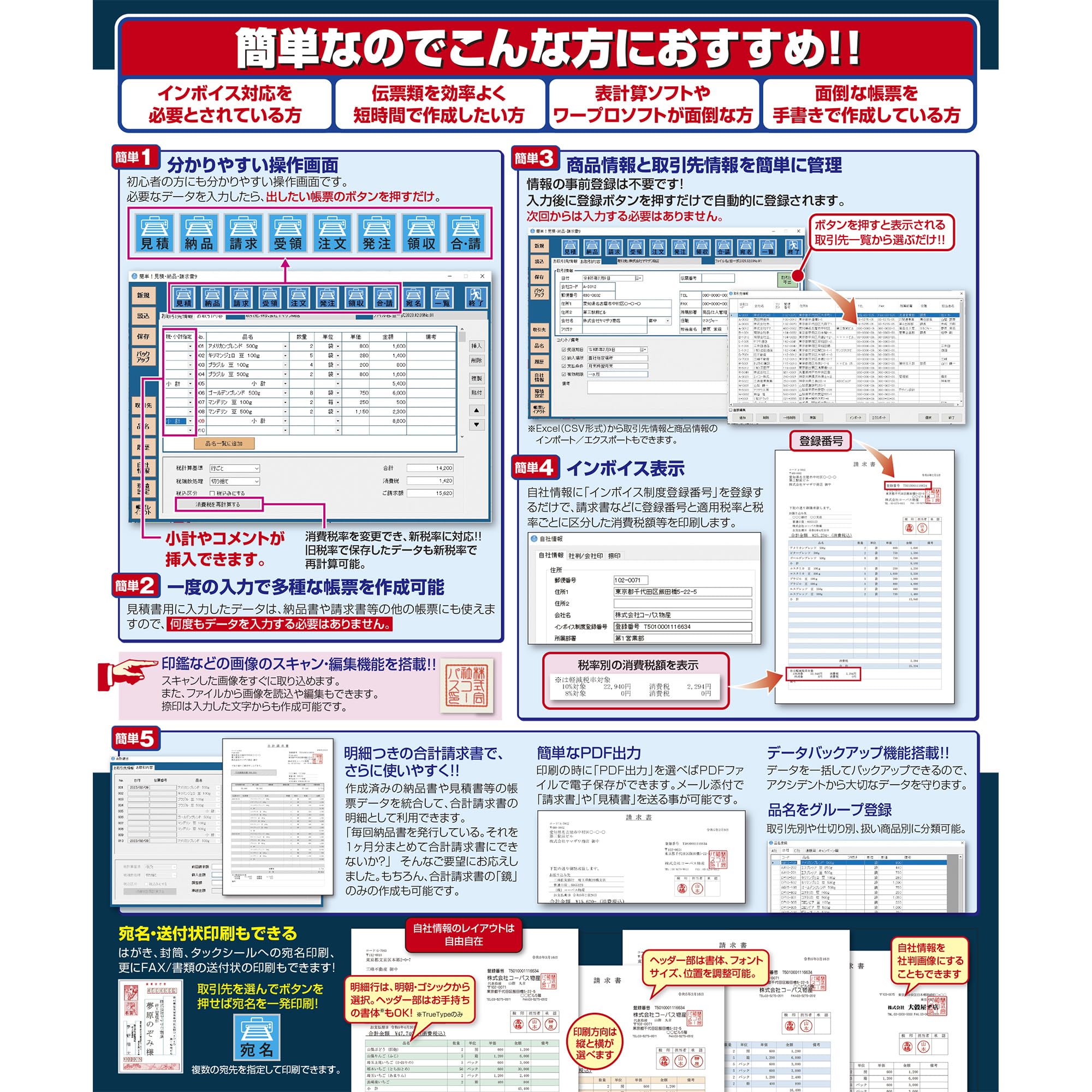 ・インボイス対応で見積・納品・請求書などの帳票が簡単に作成できる。・会社印/社判/担当印もスキャナーから簡単に読み込める。・PDF出力が出来るのでメール添付や電子保存が可能。・個々の項目に非課税/税率/小計/コメントが指定出来る。・専用用紙が必要なく、カラー印刷も可能です。
