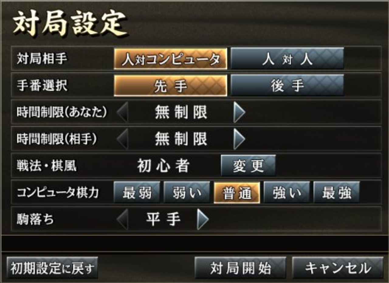 厳選された20種類の思考と各5段階のレベル設定で、初心者向けからアマ4段クラスまで、計100種類の設定が可能です。
